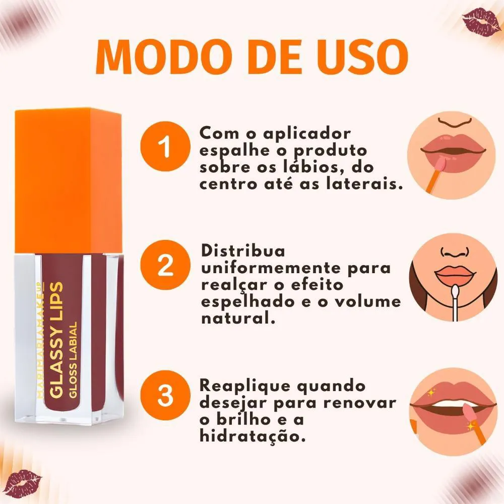 - Aplique o Gloss Labial Mari Maria Glassy Lips Yummy diretamente sobre os lábios limpos ou sobre o batom.
