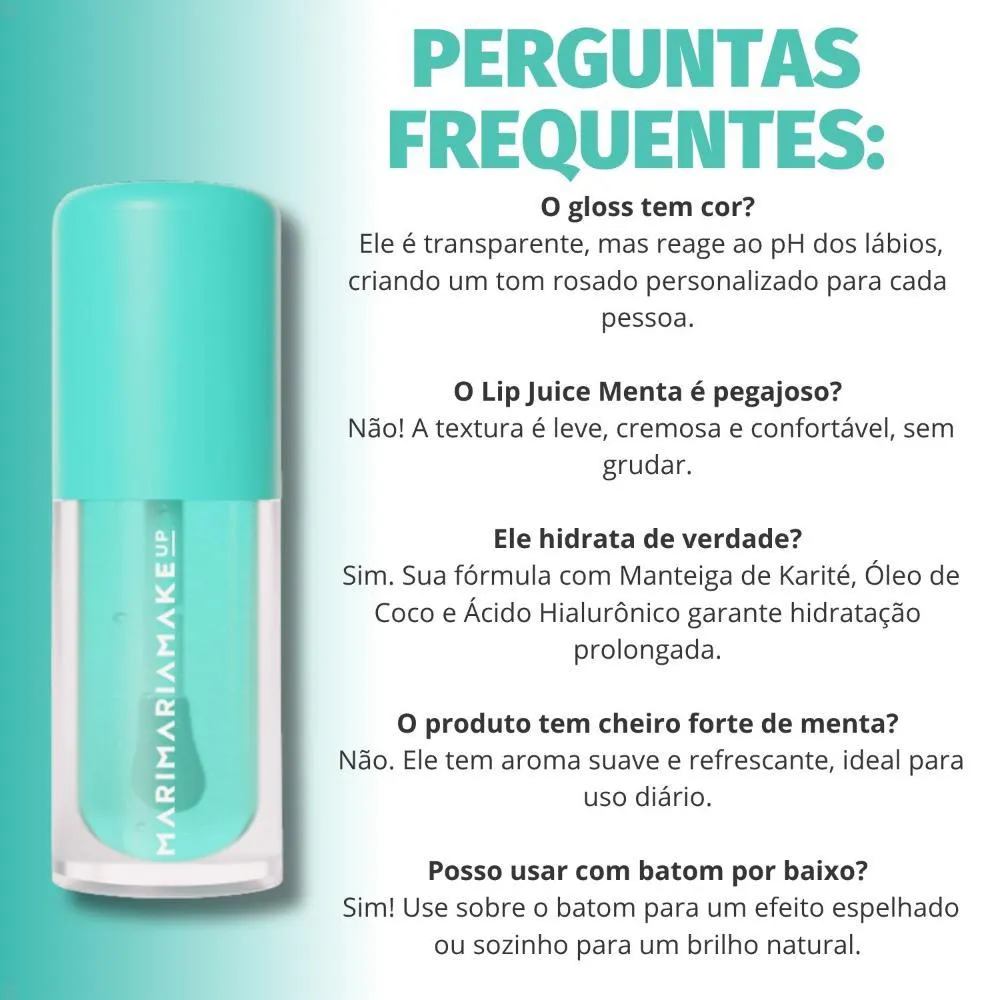 O Gloss Labial Mari Maria Makeup Lip Juice Menta é perfeito para o uso diário, adicionando um toque de cor natural e brilho sutil que complementa qualquer maquiagem. Ideal para momentos em que seus lábios precisam de hidratação e nutrição extra, ou para criar um visual fresco e radiante em qualquer ocasião. Use-o sozinho para um look natural ou sobre seu batom favorito para um efeito glamouroso.Modo de Uso/Aplicação
