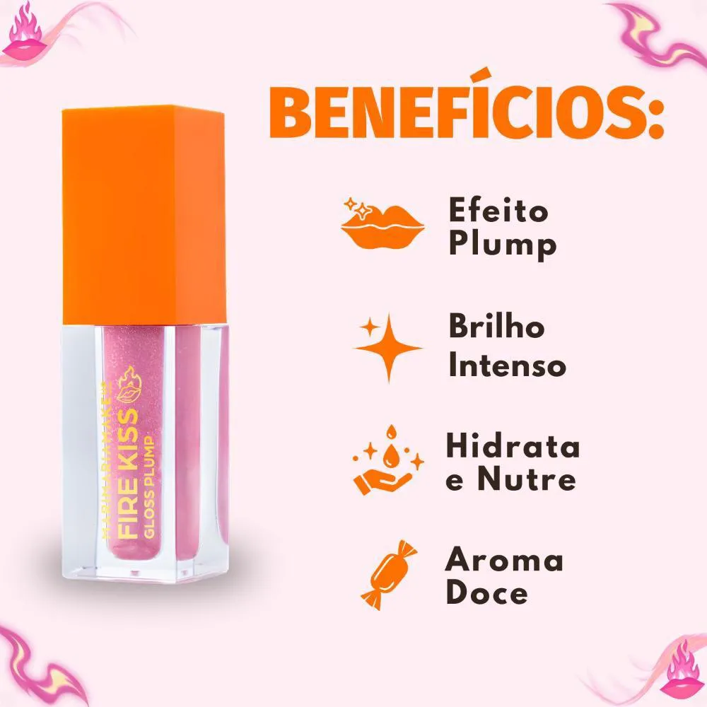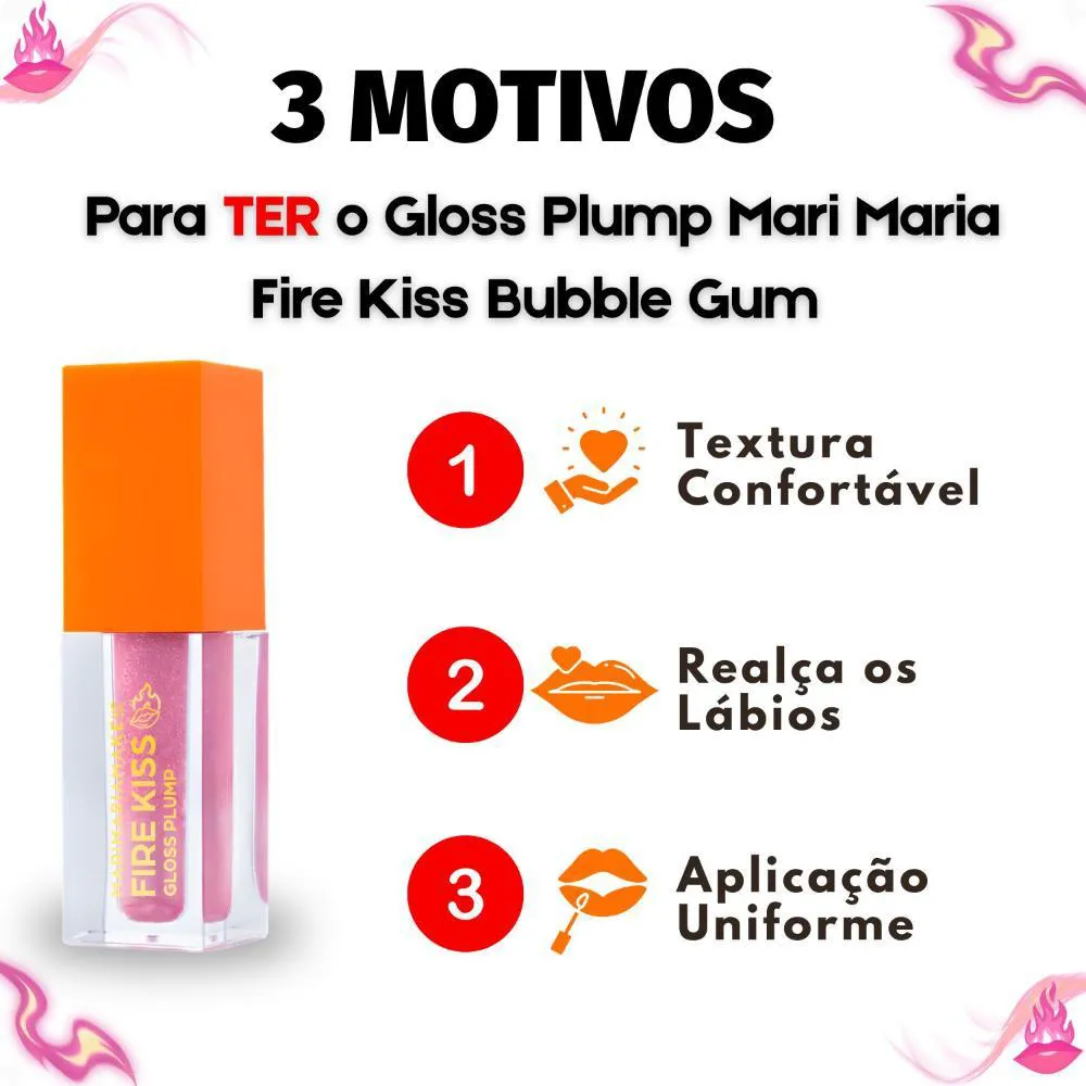 O Gloss Plump Mari Maria Makeup Fire Kiss Bubble Gum MM-7200-1 é a escolha ideal para quem deseja lábios volumosos, hidratados e irresistíveis. Com um toque doce e divertido de Bubble Gum, ele proporciona efeito plump imediato, brilho intenso e uma sensação refrescante que realça a beleza natural dos lábios. Sua fórmula confortável combina ativos hidratantes e tecnologia que estimula o volume, garantindo lábios macios e radiantes durante todo o dia.Benefícios Principais