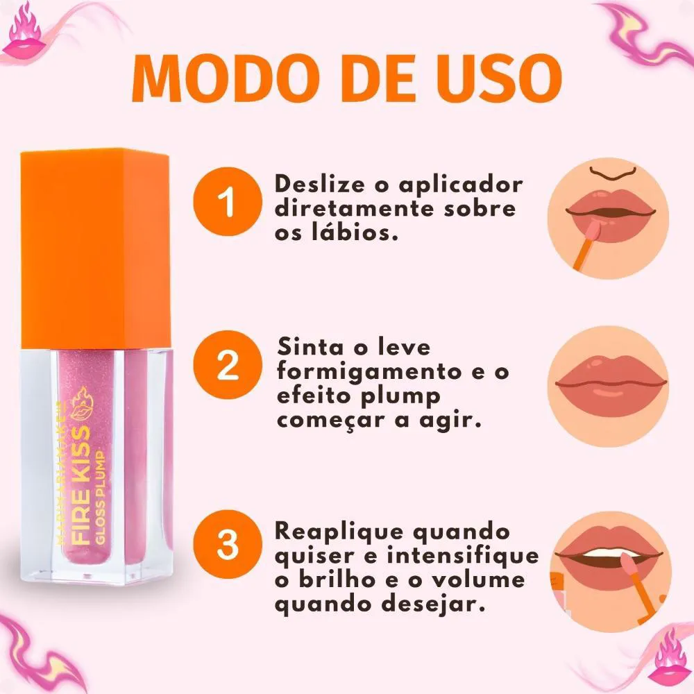 - Aplique o Gloss Plump Mari Maria Fire Kiss diretamente sobre os lábios limpos ou sobre o batom.
