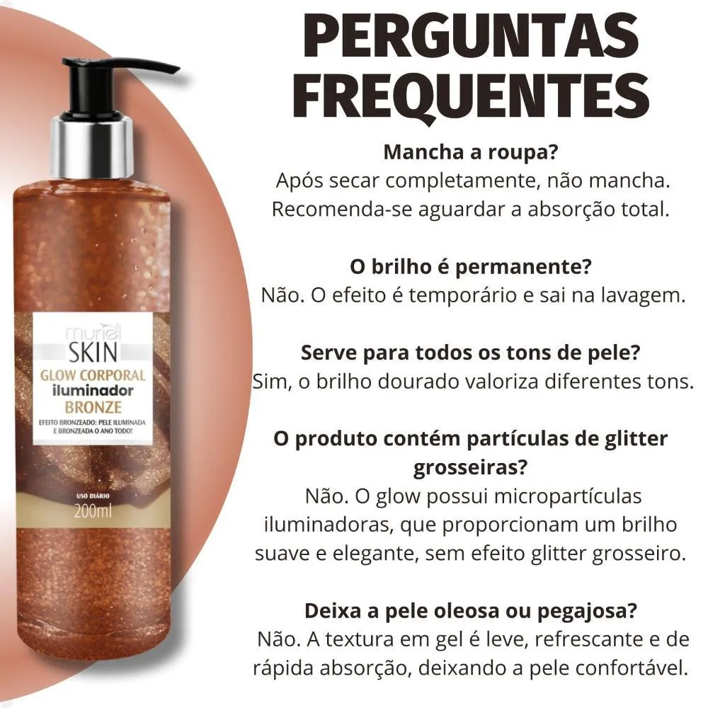 Transforme sua pele com o Glow Corporal Iluminador Muriel Skin Bronze 200ml, o segredo para um bronzeado perfeito e uma luminosidade radiante durante todo o ano! Este iluminador foi cuidadosamente desenvolvido para realçar sua beleza natural, proporcionando um brilho dourado e uma aparência de pele saudável e irresistível. Imagine-se com uma pele impecável, luminosa e bronzeada, sem precisar se expor ao sol. O Glow Corporal Iluminador Bronze da MURIEL é ideal para quem busca praticidade e resultados surpreendentes, oferecendo um efeito bronzeado instantâneo que realça sua beleza em qualquer ocasião. Experimente o poder de um bronzeado perfeito sem sair de casa e conquiste uma pele iluminada, radiante e com um brilho duradouro que eleva sua autoestima.Benefícios Principais