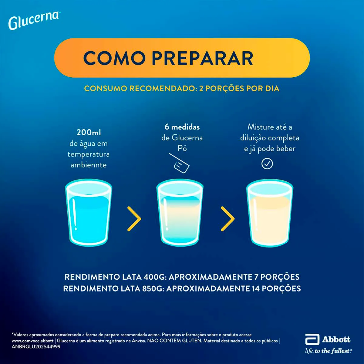 Preparar o Glucerna® SR é fácil e rápido: adicione seis medidas completas do pó em um copo com 200ml de água e misture continuamente até a diluição completa. A colher medida está incluída dentro da lata.