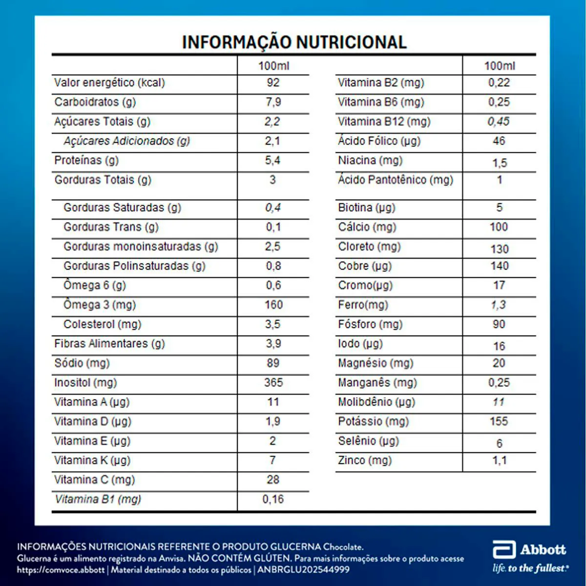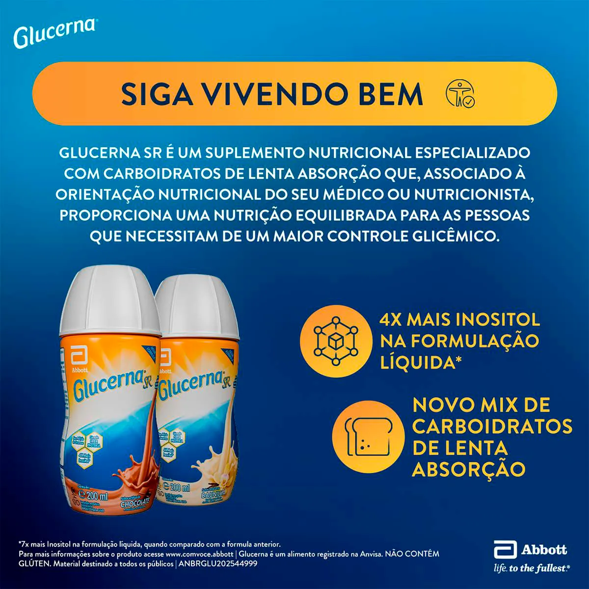 Glucerna SR Chocolate é um suplemento nutricional líquido, especialmente desenvolvido para pessoas com diabetes ou intolerância à glicose. Conta com carboidratos de lenta absorção que ajudam a estabilizar os níveis de açúcar no sangue, sendo indicado como lanche ou substituto de refeição.