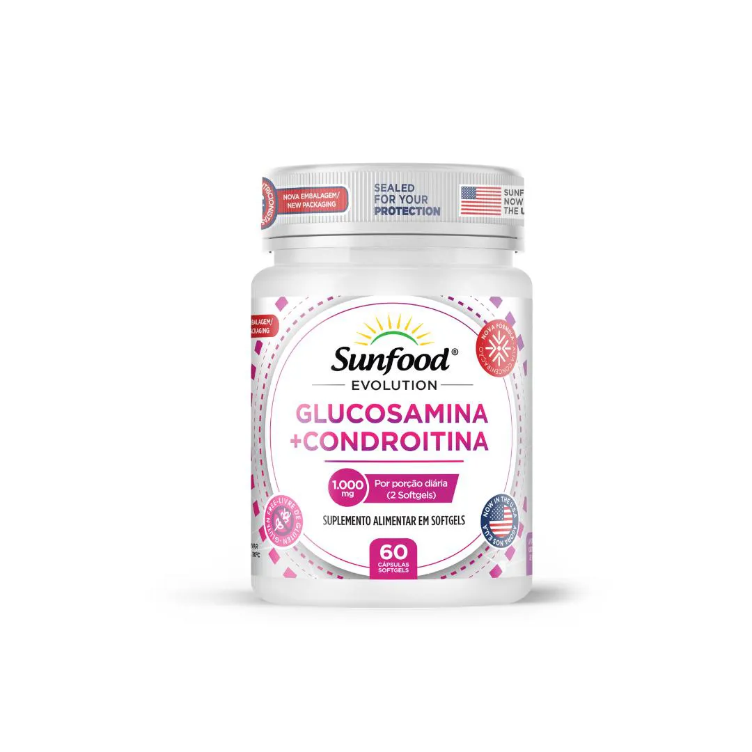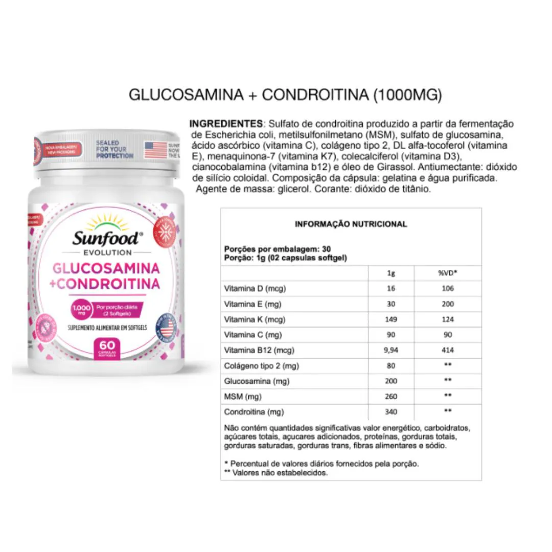 Glucosamina + Condroitina 1.000mg 60 Softgels Sunfood EvolutionINGREDIENTES Sulfato de condroitina produzido a partir da fermentação de Escherichia coli, metilsulfonilmetano (MSM), sulfato de glucosamina, ácido ascórbico (vitamina c), colágeno tipo 2, DL alfa-tocoferol (vitamina e), menaquinona-7 (vitamina K7), colecalciferol (vitamina D3), cianocobalamina (vitamina b12) e óleo de Girassol. Antiumectante: dióxido de silício coloidal.Composição da cápsula: gelatina e água purificada. Agente de massa: glicerol. Corante: dióxido de titânio. RECOMENDAÇÃO DE USO Consumir 2 softgels uma vez ao dia, de preferência perto das refeições, ou conforme a orientação do médico e ou nutricionista. Conserve o produto na embalagem original e a temperatura ambiente 15ºC a 30ºC. Após embalagem aberta, consumir em 30 dias. Produto indicado para o "Grupo Populacional 19 anos". Este produto não é um medicamento. Não exceder a recomendação diária de consumo indicada na embalagem. Mantenha fora do alcance de crianças. Este produto não deve ser consumido por gestantes lactantes e crianças. LOTE E VALIDADE NO FUNDO DA EMBALAGEM Validade 24 meses após a fabricação.