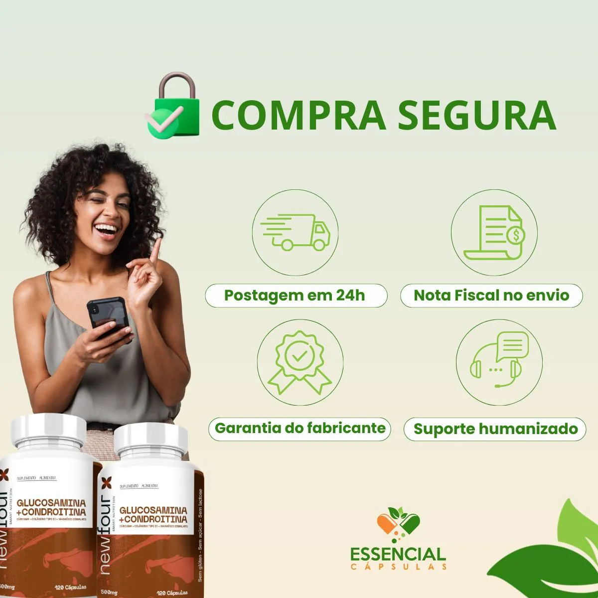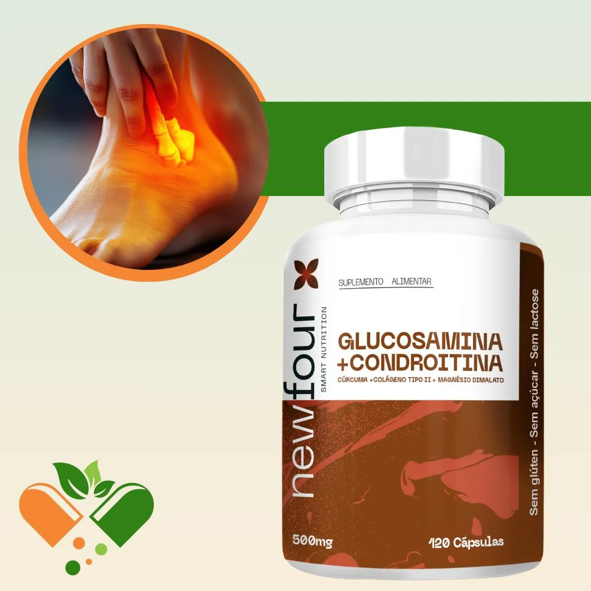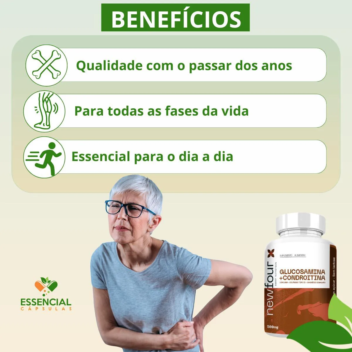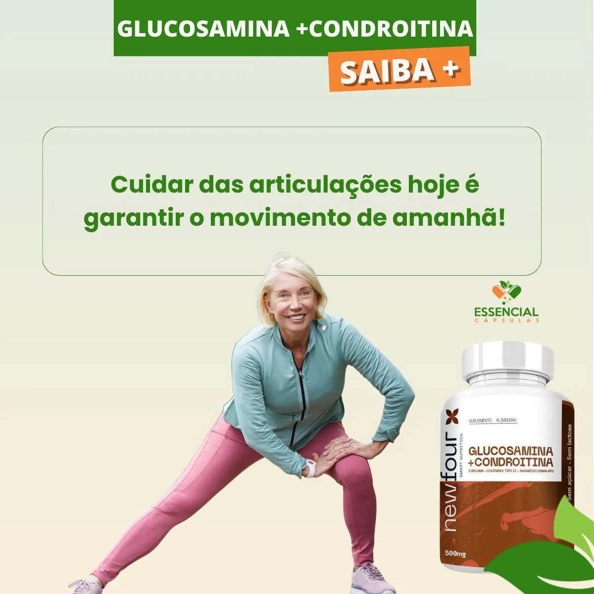 BEM VINDO(A) À ESSENCIAL CÁPSULAS Aqui, acreditamos que cuidar da saúde pode (e deve) ser algo natural, leve e diário. PRODUTO: - Glucosamina + Condroitina 120 Cápsulas MARCA: - NEW FOUR BENEFÍCIOS: ● Muito utilizada em rotinas que buscam mobilidade e conforto articular ● Ideal para quem mantém uma rotina ativa SUGESTÃO DE CONSUMO (PELO FABRICANTE): - 04 Cápsulas por dia. IMPORTANTE SABER: - Este produto é um suplemento alimentar natural. - Não é medicamento e não substitui uma alimentação equilibrada nem o acompanhamento de um profissional da saúde. - Como um produto natural, seus benefícios podem ser vistos a partir de alguns dias do uso. - Os suplementos são destinados a pessoas saudáveis. Sua finalidade é fornecer nutrientes, substâncias bioativas, enzimas ou probióticos em complemento à alimentação. COMPOSIÇÃO: - CÚRCUMA (EXTRATO DE RIZOMAS DE CÚRCUMA LONGA), colágeno DE FRANGO COM COLÁGENO TIPO II NÃO DESNATURADO, DIMAGNÉSIO MALATO, GLUCOSAMINA (CLORIDRATO DE GLUCOSAMINA OBTIDO A PARTIR DE FERMENTAÇÃO POR E. COLI AT-29) E CONDROITINA (SULFATO DE CONDROITINA PRODUZIDO A PARTIR DA FERMENTAÇÃO DE ESCHERICHIA). NÃO CONTÉM GLÚTEN CONTRAINDICAÇÃO: - O uso não é recomendado para gestantes, lactantes e crianças. - Em caso de uso contínuo de medicamentos ou condições específicas de saúde, busque a orientação de um profissional da saúde. QUALIDADE: - Sabemos que o mercado de suplementos é competitivo, com opções para todos os públicos e faixas de preço. Na nossa loja, priorizamos a qualidade em cada detalhe. Por isso, escolhemos trabalhar apenas com fábricas que utilizam matérias-primas de excelência e seguem rigorosos padrões de produção. ENVIAMOS RAPIDINHO: - Seu pedido é preparado com todo cuidado e postado em até 24 horas úteis após a confirmação da compra. (Na maioria das vezes, enviamos bem antes disso)! FALE CONOSCO: Tem dúvidas ou quer conversar sobre o produto? Nosso atendimento é humanizado e está sempre pronto para te ouvir com muita atenção!