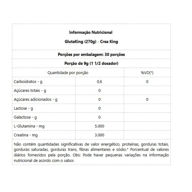 GlutaKing (270g) GlutaKing da Crea King é uma fórmula avançada que combina os benefícios de glutamina e creatina em uma dose saborosa e refrescante, projetada para suportar a recuperação muscular, o desempenho e a resistência física. Com uma dose precisa e equilibrada, GlutaKing é o parceiro ideal para quem busca resultados rápidos e eficazes no pós-treino.Glutamina (5g por dose): Este aminoácido essencial na recuperação muscular contribui para a redução da fadiga e o fortalecimento do sistema imunológico, acelerando a regeneração dos tecidos após exercícios intensos. A glutamina ajuda ainda a prevenir o catabolismo muscular, protegendo os ganhos de massa magra.Creatina (3g por dose): Reconhecida por aumentar a força e a explosão muscular, a creatina potencializa a síntese de ATP, fornecendo energia rápida e sustentável para atividades de alta intensidade. É um suplemento chave para quem busca melhorar o desempenho em treinos pesados e intensos. Benefícios: Recuperação acelerada: Glutamina para a regeneração e proteção muscular, reduzindo dores pós-treino.Maior força e explosão: Com 3g de creatina para suporte em exercícios de alta intensidade.Sabor refrescante de limão: Uma opção deliciosa que facilita o consumo diário.Suporte imunológico: Fortalecimento das defesas naturais, especialmente benéfico para quem realiza treinos frequentes e intensos.