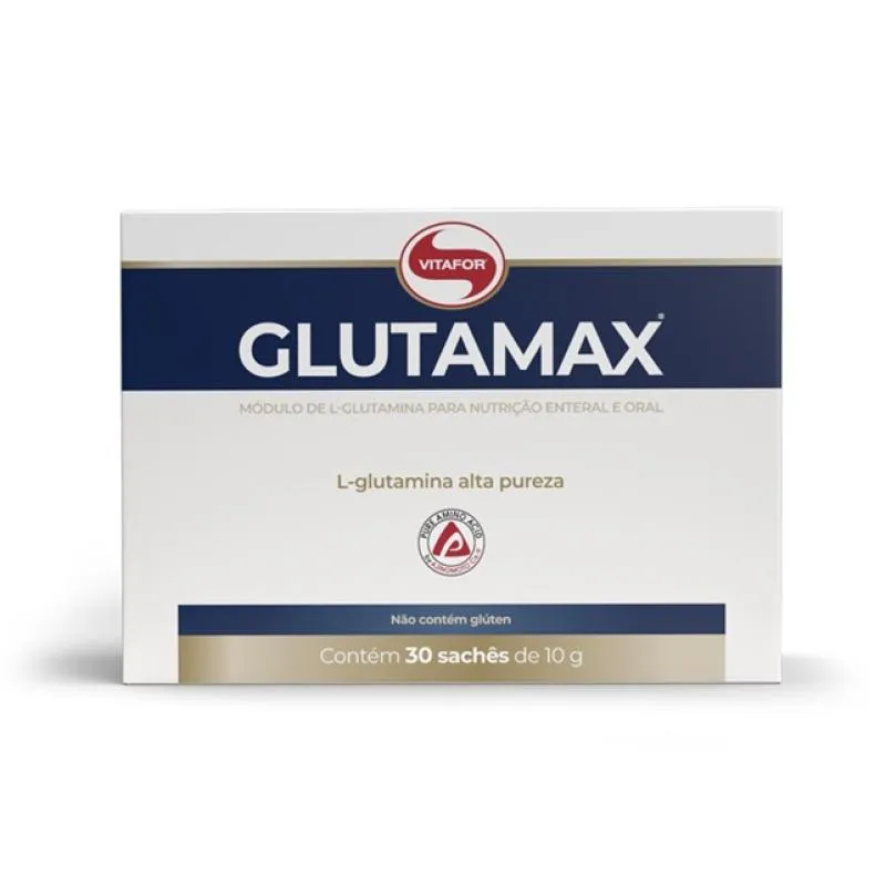 Glutamax Sachê (10g) Módulo de glutamina é um nutriente destinado a nutrição enteral e/ou oral. Composto por L-glutamina pura e isolada. Glutamax Vitafor é um módulo nutricional, ou seja, é composto por nutrientes selecionados que auxiliam a modular a alimentação, contribuindo para o equilíbrio intestinal, fortalecimento do sistema imunológico e prevenção do catabolismo muscular (degradação da musculatura). BENEFÍCIOS:* L-glutamina de alta pureza;* Reguladora de distúrbios intestinais;* Anabólica, promovendo crescimento muscular;* Fortalecedora, por ser um nutriente para as células imunológicas. DIFERENCIAIS:* Praticidade de consumo: versão pote e sachês;* Pode ser utilizado para módulos enteral e oral;* Uso adulto e pediátrico;* Sem glúten, lactose e sem adoçantes artificiais.