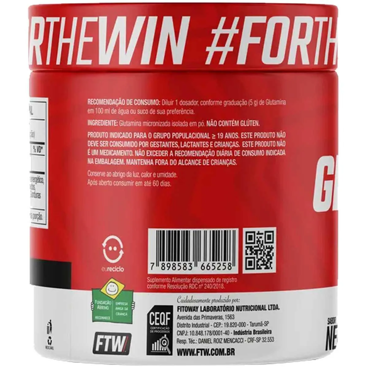 Glutamina micronizada isolada em pó. NÃO CONTÉM GLÚTEN.
