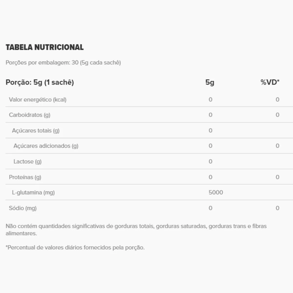 A composição consiste em 100% L‑glutamina obtida por tecnologia de fermentação vegetal da Ajinomoto Co., que utiliza matéria-prima derivada da cana-de-açúcar, resultando em um produto de elevada pureza e qualidade. O aminoácido é livre de açúcares, glúten, lactose, conservantes, corantes e adoçantes artificiais, e não contém aminoácidos de origem animal.