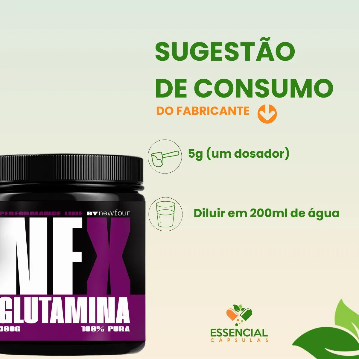 BEM VINDO(A) À ESSENCIAL CÁPSULAS Aqui, acreditamos que cuidar da saúde pode (e deve) ser algo natural, leve e diário. PRODUTO: - glutamina MARCA: - NEW FOUR BENEFÍCIOS: ● Aminoácido naturalmente presente no organismo ● Ideal para quem busca constância nos treinos ● Voltada ao equilíbrio intestinal SUGESTÃO DE CONSUMO (PELO FABRICANTE): - 5g (1 dosador) - Diluir em 200ml de água IMPORTANTE SABER: - Este produto é um suplemento alimentar natural. - Não é medicamento e não substitui uma alimentação equilibrada nem o acompanhamento de um profissional da saúde. - Como um produto natural, seus benefícios podem ser vistos a partir de alguns dias do uso. - Os suplementos são destinados a pessoas saudáveis. Sua finalidade é fornecer nutrientes, substâncias bioativas, enzimas ou probióticos em complemento à alimentação. COMPOSIÇÃO: - L- Glutamina em pó. NÃO CONTÉM GLÚTEN CONTRAINDICAÇÃO: - O uso não é recomendado para gestantes, lactantes e crianças. - Em caso de uso contínuo de medicamentos ou condições específicas de saúde, busque a orientação de um profissional da saúde. QUALIDADE: - Sabemos que o mercado de suplementos é competitivo, com opções para todos os públicos e faixas de preço. Na nossa loja, priorizamos a qualidade em cada detalhe. Por isso, escolhemos trabalhar apenas com fábricas que utilizam matérias-primas de excelência e seguem rigorosos padrões de produção. ENVIAMOS RAPIDINHO: - Seu pedido é preparado com todo cuidado e postado em até 24 horas úteis após a confirmação da compra. (Na maioria das vezes, enviamos bem antes disso)! FALE CONOSCO: Tem dúvidas ou quer conversar sobre o produto? Nosso atendimento é humanizado e está sempre pronto para te ouvir com muita atenção!