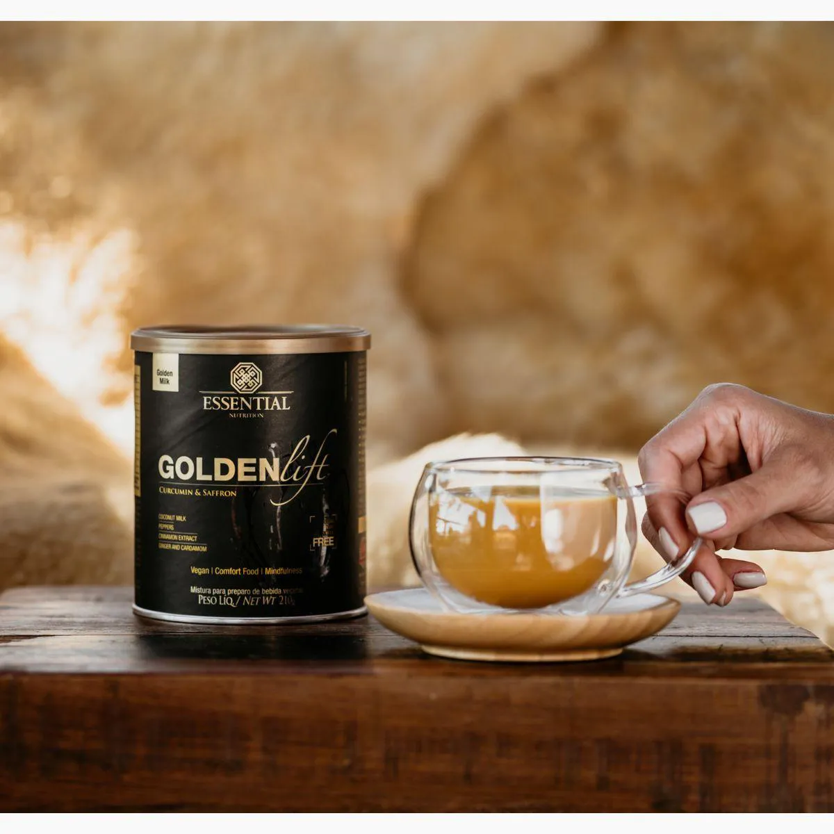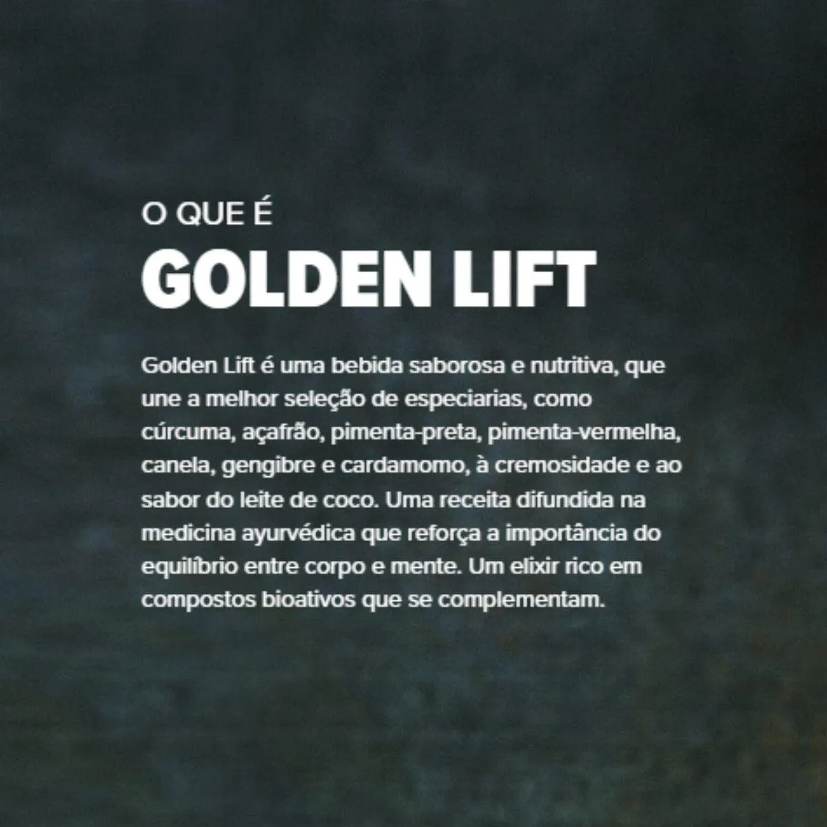 O Golden Lift é um preparo em pó à base de cúrcuma, gengibre, canela e outras especiarias, conhecido como golden milk. É uma mistura de ingredientes naturais como cúrcuma padronizada, gengibre, canela, cardamomo, pimenta-do-reino e óleo de coco em pó, adoçado com estévia.