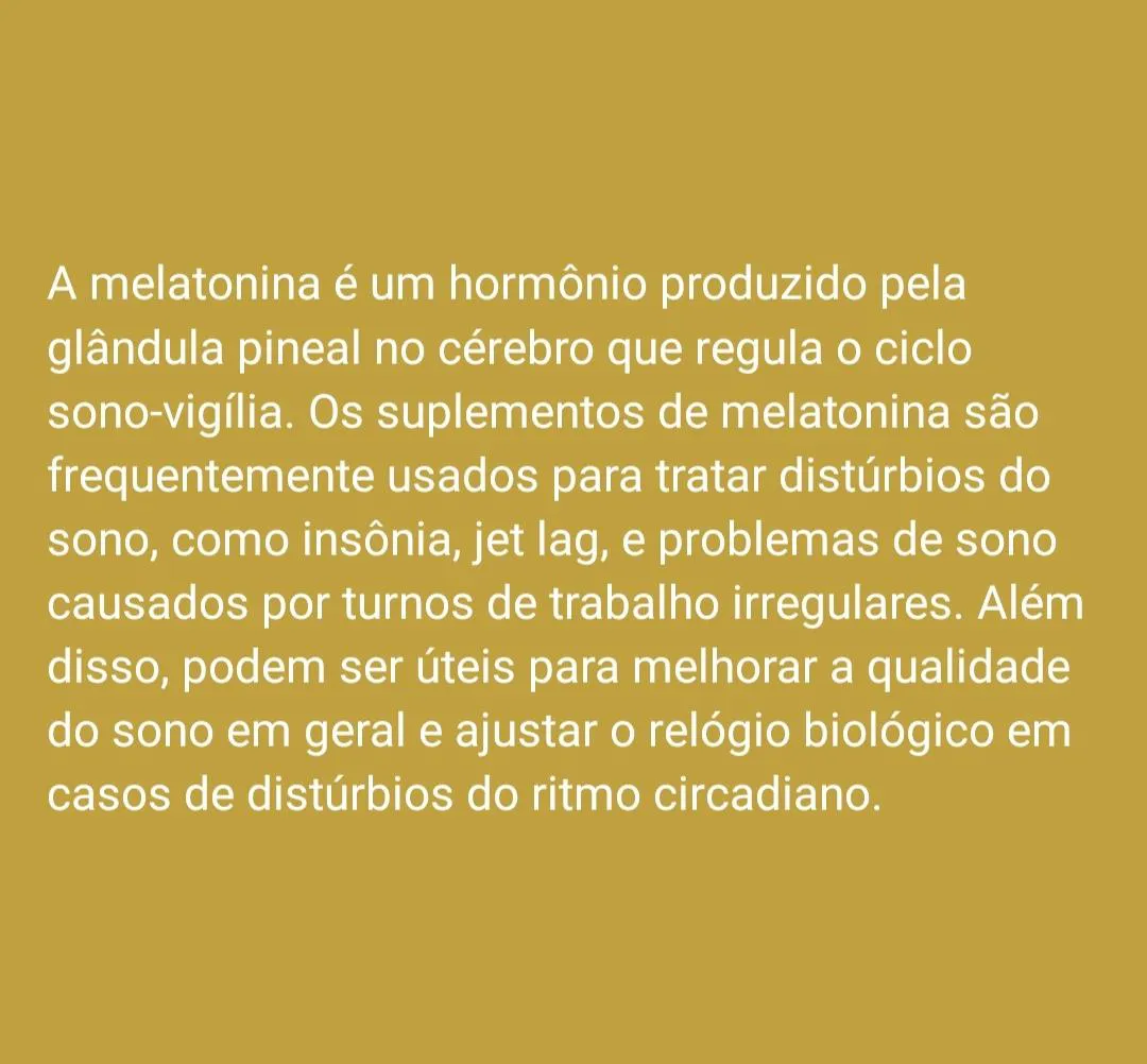 A melatonina é um hormônio produzido pela glândula pineal no cérebro que regula o ciclo sono-vigília. Os suplementos de melatonina são frequentemente usados para tratar distúrbios do sono, como insônia, jet lag, e problemas de sono causados por turnos de trabalho irregulares. Além disso, podem ser úteis para melhorar a qualidade do sono em geral e ajustar o relógio biológico em casos de distúrbios do ritmo circadiano.
