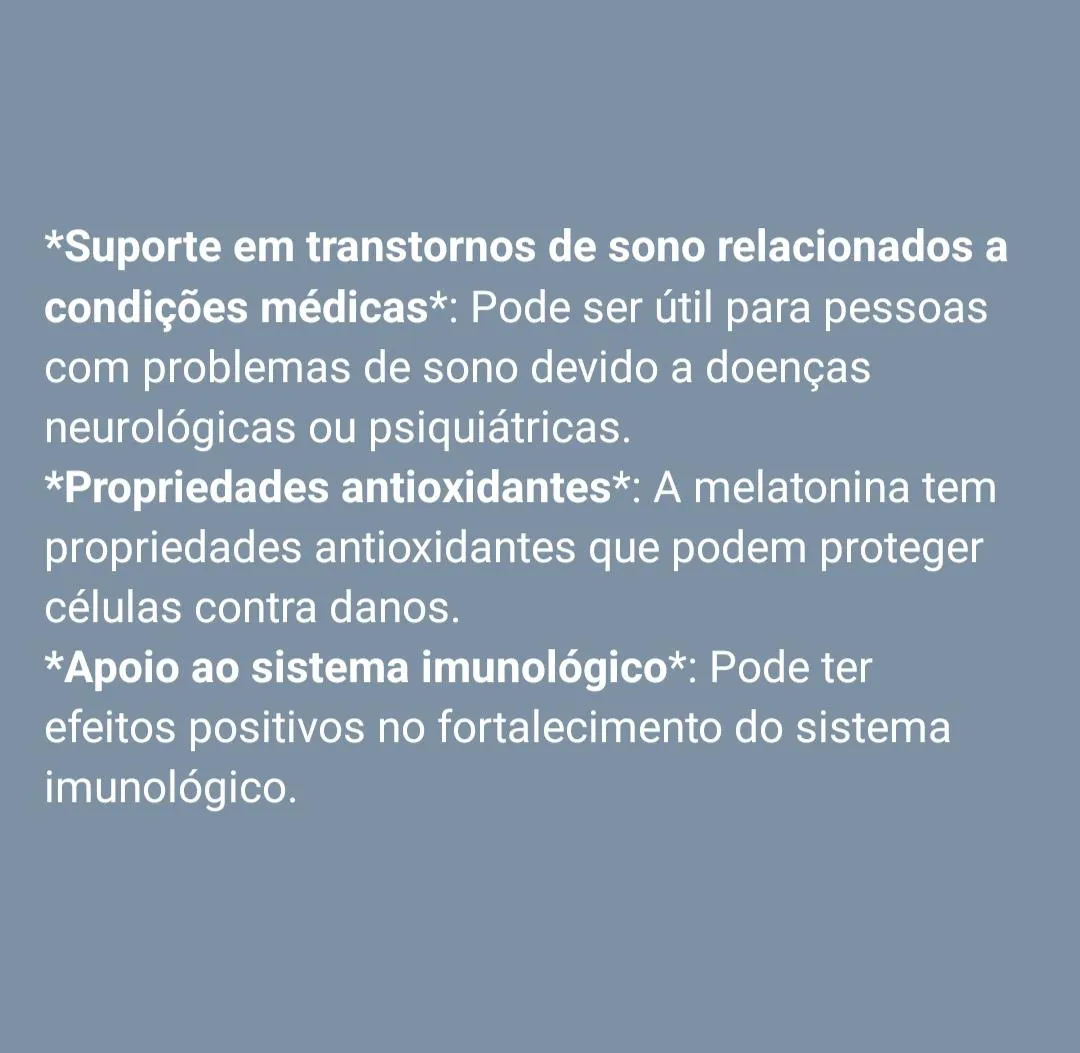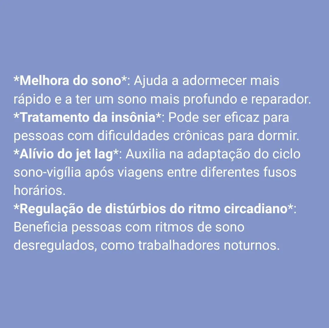 *Melhora do sono: Ajuda a adormecer mais rápido e a ter um sono mais profundo e reparador.*Tratamento da insônia: Pode ser eficaz para pessoas com dificuldades crônicas para dormir.*Alívio do jet lag: Auxilia na adaptação do ciclo sono-vigília após viagens entre diferentes fusos horários.*Regulação de distúrbios do ritmo circadiano: Beneficia pessoas com ritmos de sono desregulados, como trabalhadores noturnos.*Suporte em transtornos de sono relacionados a condições médicas: Pode ser útil para pessoas com problemas de sono devido a doenças neurológicas ou psiquiátricas.*Propriedades antioxidantes: A melatonina tem propriedades antioxidantes que podem proteger células contra danos.*Apoio ao sistema imunológico: Pode ter efeitos positivos no fortalecimento do sistema imunológico.