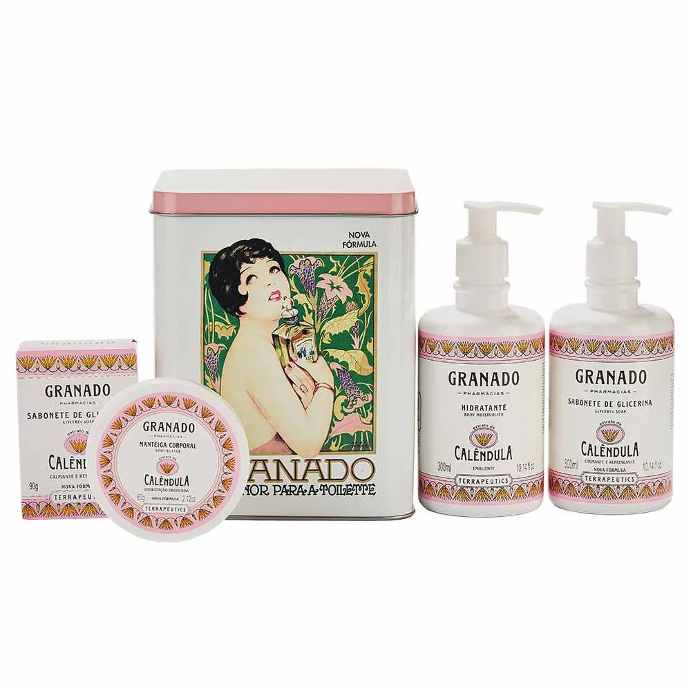 Lata decorativa com produtos na fragrância Calêndula, da linha Terrapeutics. Ideal para presentear, a lata contém produtos essenciais para o cuidado pessoal com extrato natural de Calêndula, que tem ação calmante.