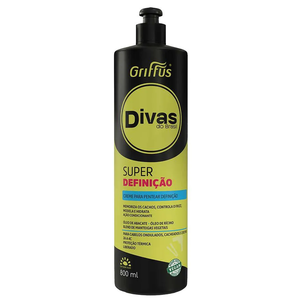 O Creme Para Pentear Super Definição Divas do Brasil Griffus é um produto capilar desenvolvido para definição e tratamento de cachos, com fórmula vegana e livre de ingredientes nocivos como parabenos, corantes artificiais, óleo mineral e silicone. Contém ativos naturais como Óleo de Abacate, Óleo de Rícino e Blend de Manteigas Vegetais que nutrem e hidratam os fios.