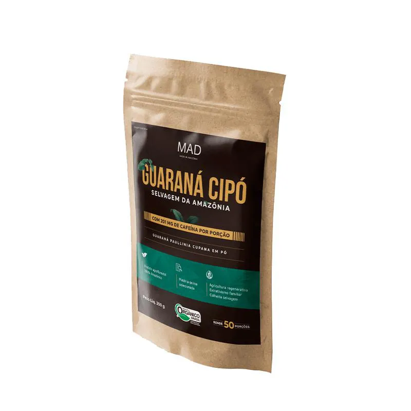 Descrição: Os grãos do Guaraná da MAD são selecionados na floresta a partir de uma espécie de cipó centenário, endêmico da região Amazônica que é colhida por índios agroextrativistas sem danificar a planta. É uma espécie endêmica selvagem. Depois, é cozido em baixa temperatura em forno de barro e moído em moinhos especiais feitos de pedra de granito para evitar a oxidação. O guaraná cipó é uma planta nativa da bacia amazónica. É um cipó lenhoso que sobe em árvores e produz sementes ricas em cafeína, tanino, teobromina, teofilina, xantina, oligoelementos e vitaminas. É o verdadeiro guaraná cipó, pois é puro, ao contrário do guaraná industrial, que é um arbusto original do Centro Oeste, e costuma ser clonado. Ingredientes e Tabela Nutricional