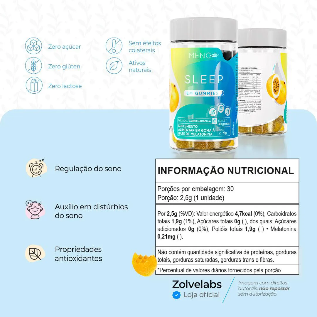 Melatonina (1,5 mg por goma): age no relógio biológico, favorecendo o início natural do sono.