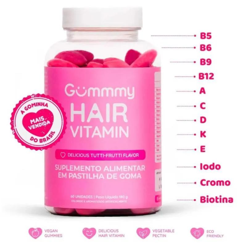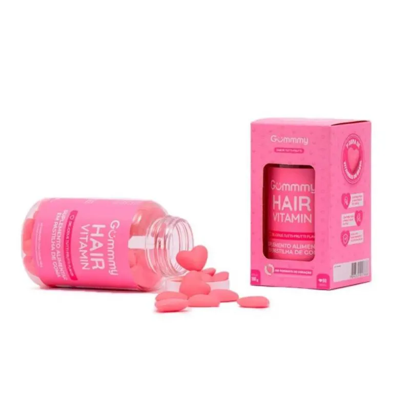 Gummy Hair Vitamin é um suplemento alimentar em gomas com forma de coração. Este suplemento combina várias vitaminas e por isso estimula o crescimento do cabelo, diminuindo a queda, quebra dos fios e ainda contribui para a hidratação natural.