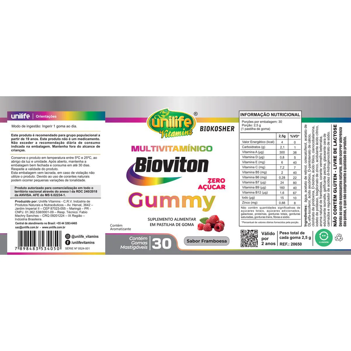 Gummy Multivitamínico Sabor Framboesa Unilife 30 gomas GUMMIES - São suplementos em forma de pastilhas de goma, livres de glúten e zero açúcar, com nutrientes diversos que atendem a várias funções no organismo. A goma utilizada é a pectina gelificante e glaceante cera de carnaúba. Os aromas e corantes são naturais e edulcorante isomalte. Multivitamínico – Suplemento enriquecido com nutrientes com ação antioxidante, participa do fortalecimento do sistema imune e promove disposição física. Contém boa quantidade de vitaminas e minerais que podem complementar a alimentação de forma equilibrada.