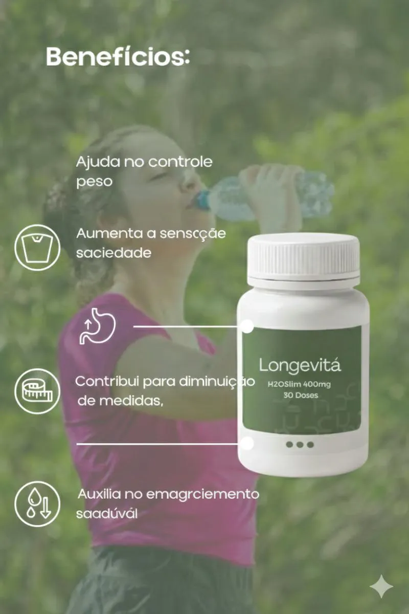 O H2OSlim 400mg – Longevitá é um suplemento alimentar desenvolvido para auxiliar no equilíbrio hídrico do organismo , contribuindo para a redução da retenção de líquidos e da sensação de inchaço.Ideal para quem busca mais leveza no dia a dia, o H2OSlim atua como apoio nutricional , auxiliando o organismo a manter o equilíbrio quando adicionado a uma rotina saudável.Principais benefícios: