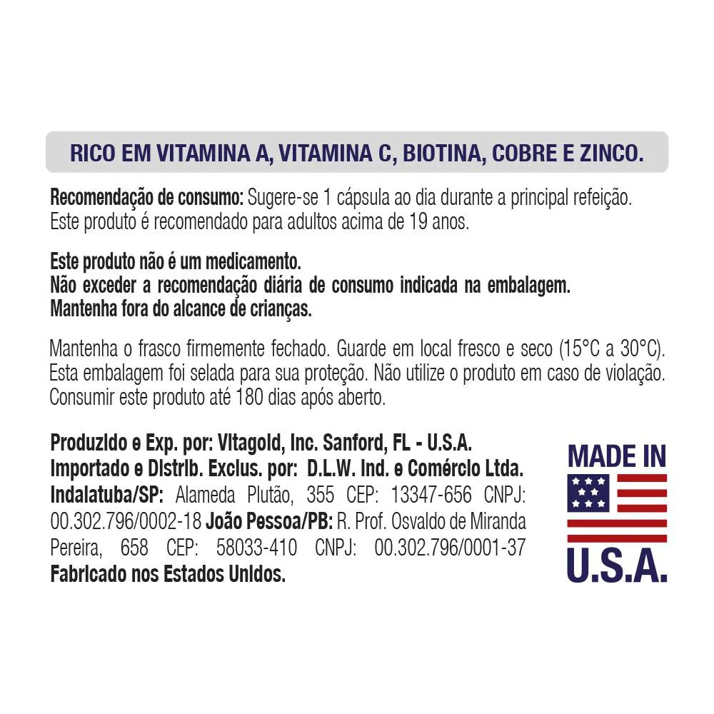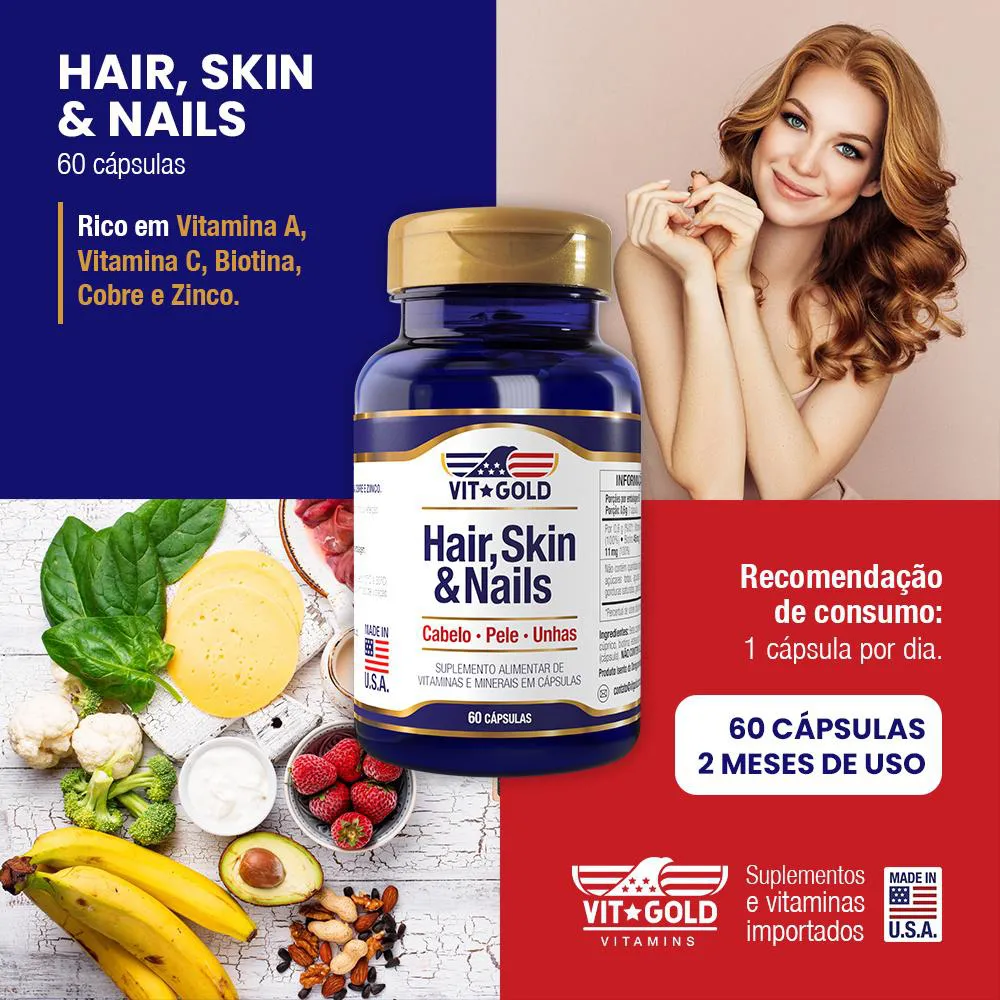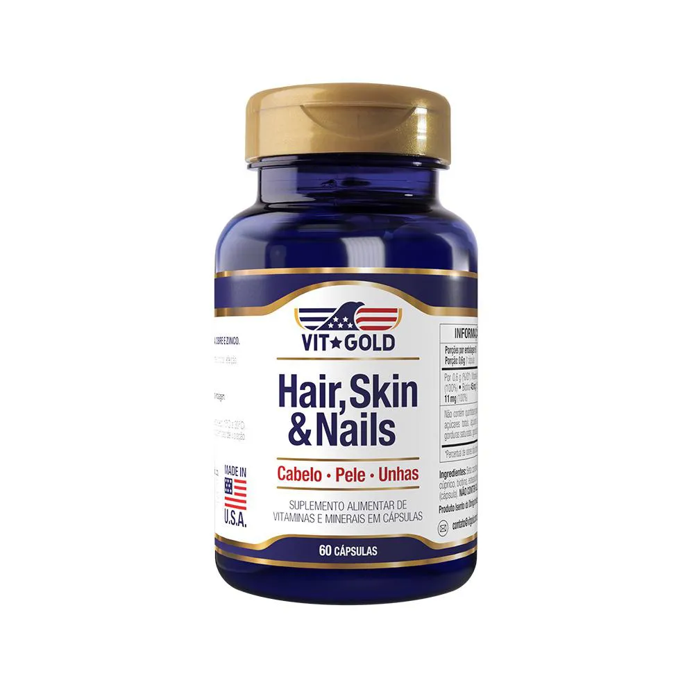 Hair, Skin and Nails (cabelo, pele e unhas) Vitgold 60 cápsulas.O HAIR, SKIN & NAILS é um suplemento à base de vitaminas e minerais que auxiliam no fortalecimento dos cabelos deixando-os mais saudáveis e flexíveis, na estabilidade e aparência da pele e na saúde e resistência das unhas. Rico em vitamina A, C, Biotina, Cobre e Zinco. Recomendação de Consumo: Sugere-se 1 cápsula ao dia durante a refeição principal.Apresentação: 60 cápsulas.Produto isento da Obrigatoriedade de Registro conforme RDC nº 27/10 e RDC nº240/18.Fabricado nos Estados Unidos.