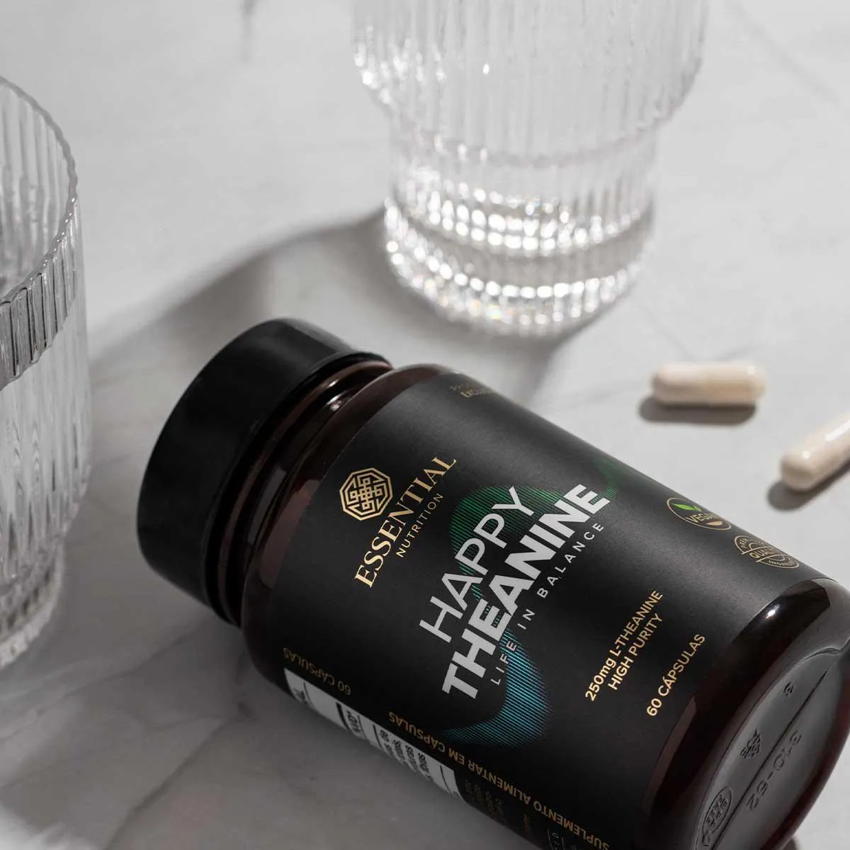O Happy Theanine é um suplemento alimentar formulado com L-teanina pura e concentrada, extraída das folhas de Camellia sinensis, com elevado grau de pureza. Cada cápsula contém 250mg de L-teanina, uma substância bioativa naturalmente encontrada em chá verde e matchá.