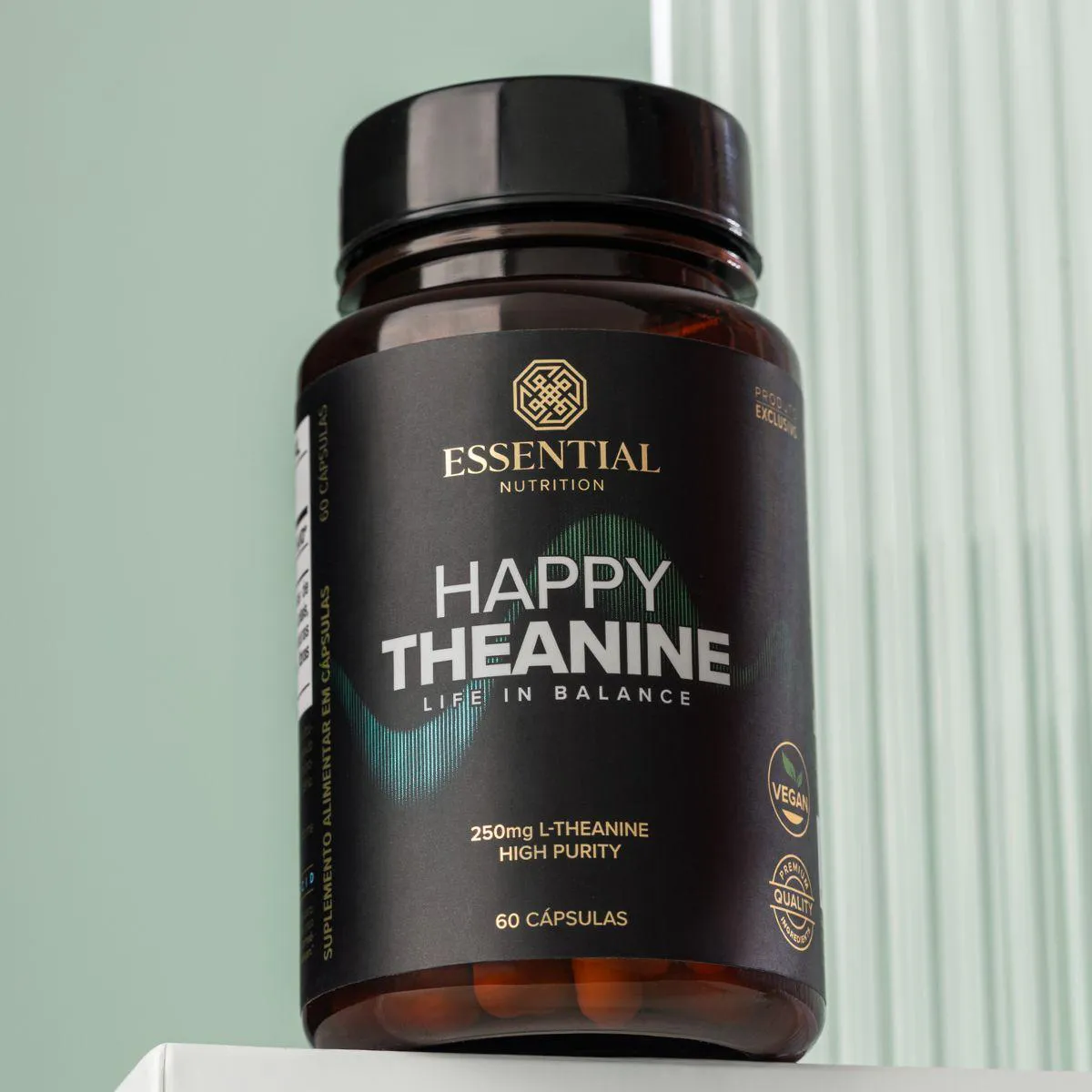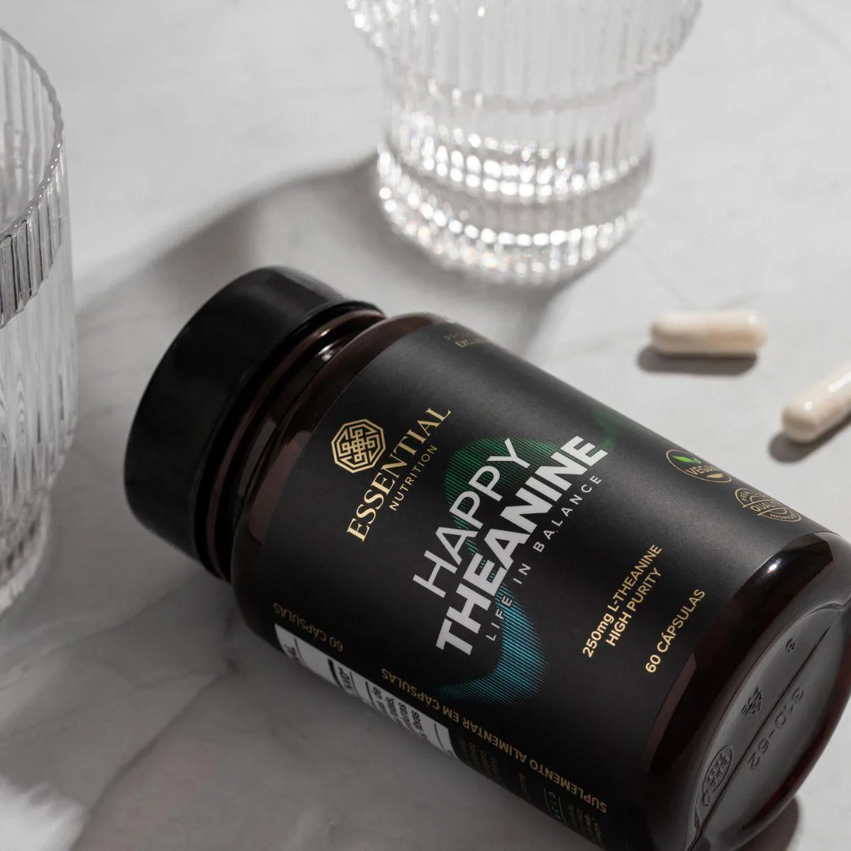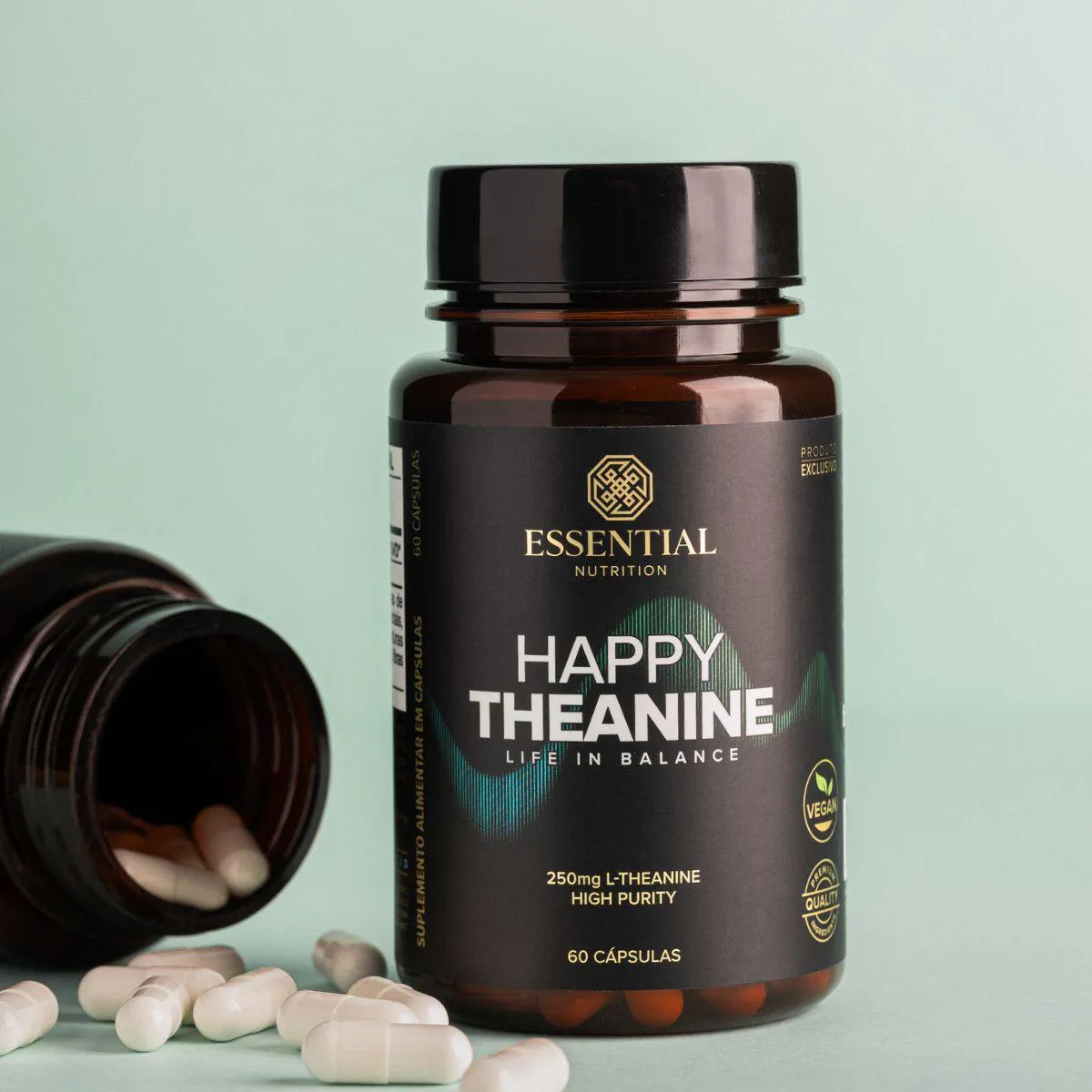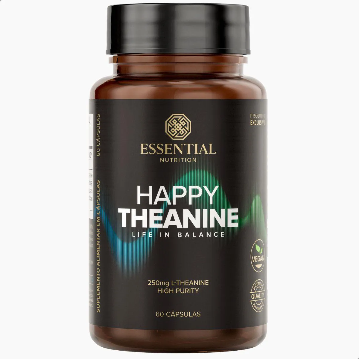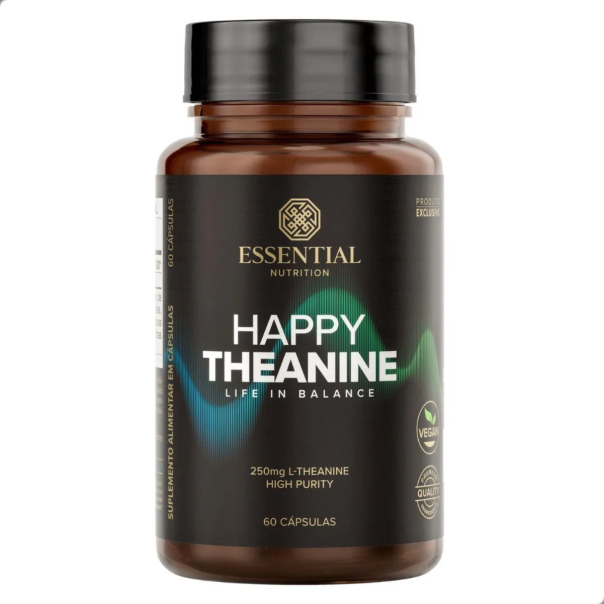 Happy Theanine Life In Balance da Essential Nutrition contém 60 cápsulas com 250 mg de L-teanina cada, composta por este aminoácido encontrado naturalmente no chá verde. Pensado para quem busca apoio nutricional para momentos de relaxamento e equilíbrio, o produto oferece dosagem conveniente em cápsulas veganas.