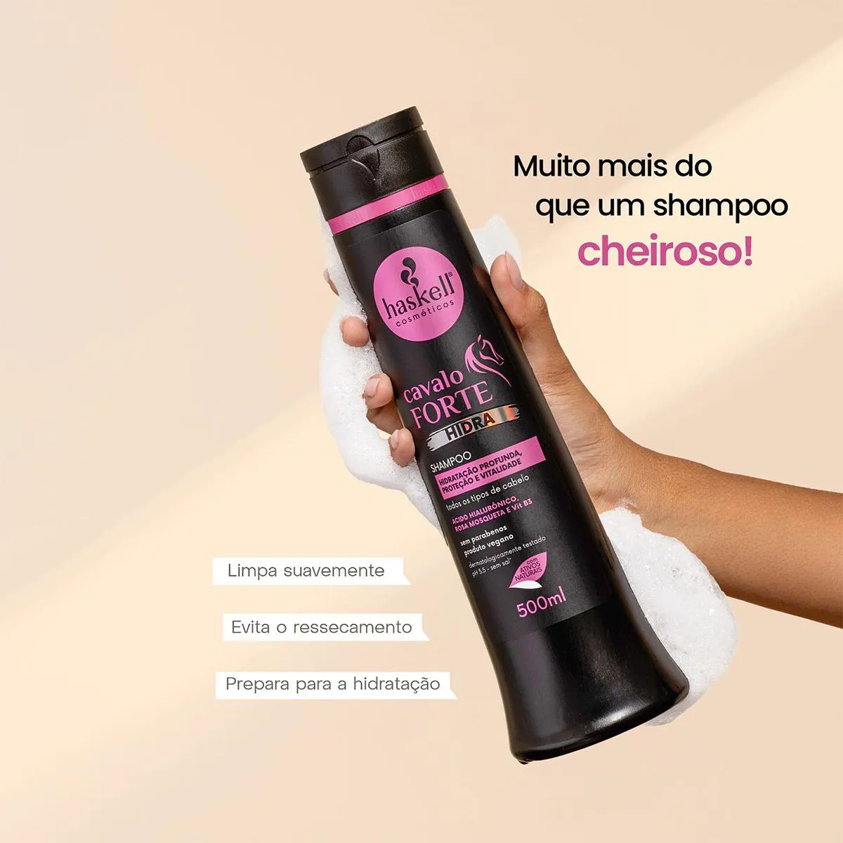 O melhor do Cavalo Forte aliado ao poder da hidratação! Com ácido hialurônico, rosa mosqueta e vitamina B3, a linha promove hidratação intensa aos cabelos, agindo na camada mais profunda da fibra capilar, evitando o ressecamento e proporcionando vitalidade, proteção, força e brilho aos cabelos. Este Kit ContémHaskell Hidra Cavalo Forte - Shampoo 500ml: promove limpeza suave e age diretamente na hidratação dos fios. Desenvolvido especialmente para realizar a reposição hídrica nos fios, formulado com ácido hialurônico, rosa mosqueta e vitamina B3 que agem na camada mais profunda do fio, evitando o ressecamento e deixando os cabelos com mais maleabilidade, hidratação intensa e brilho extra à fibra capilar.