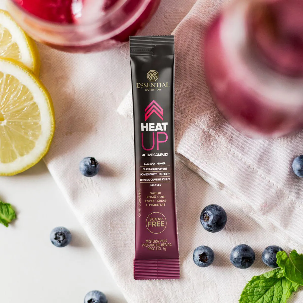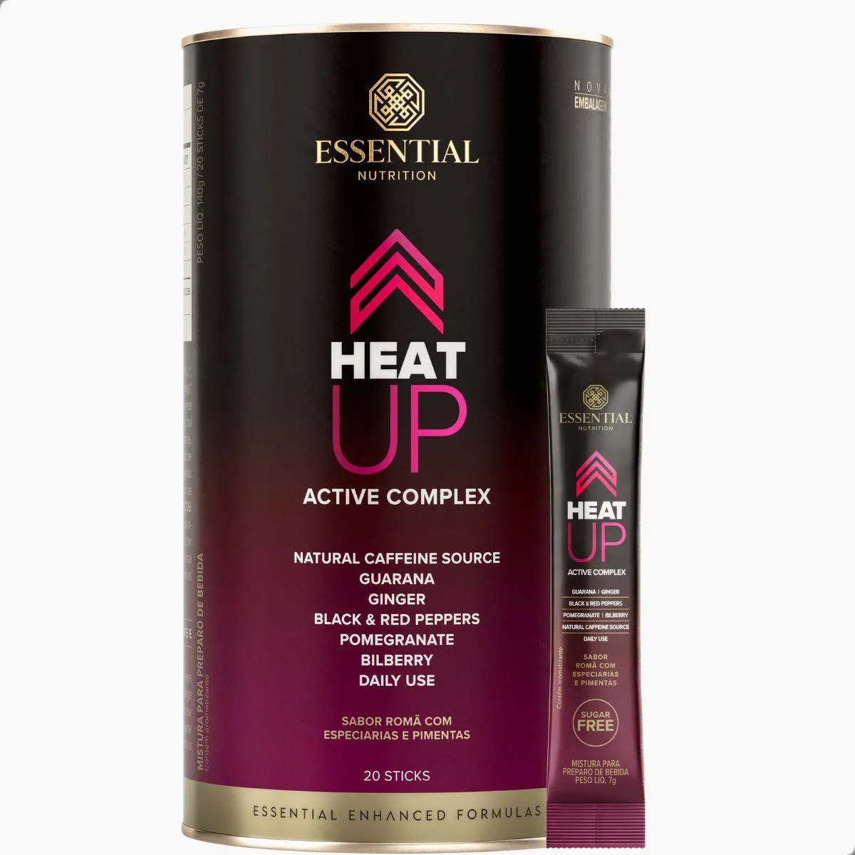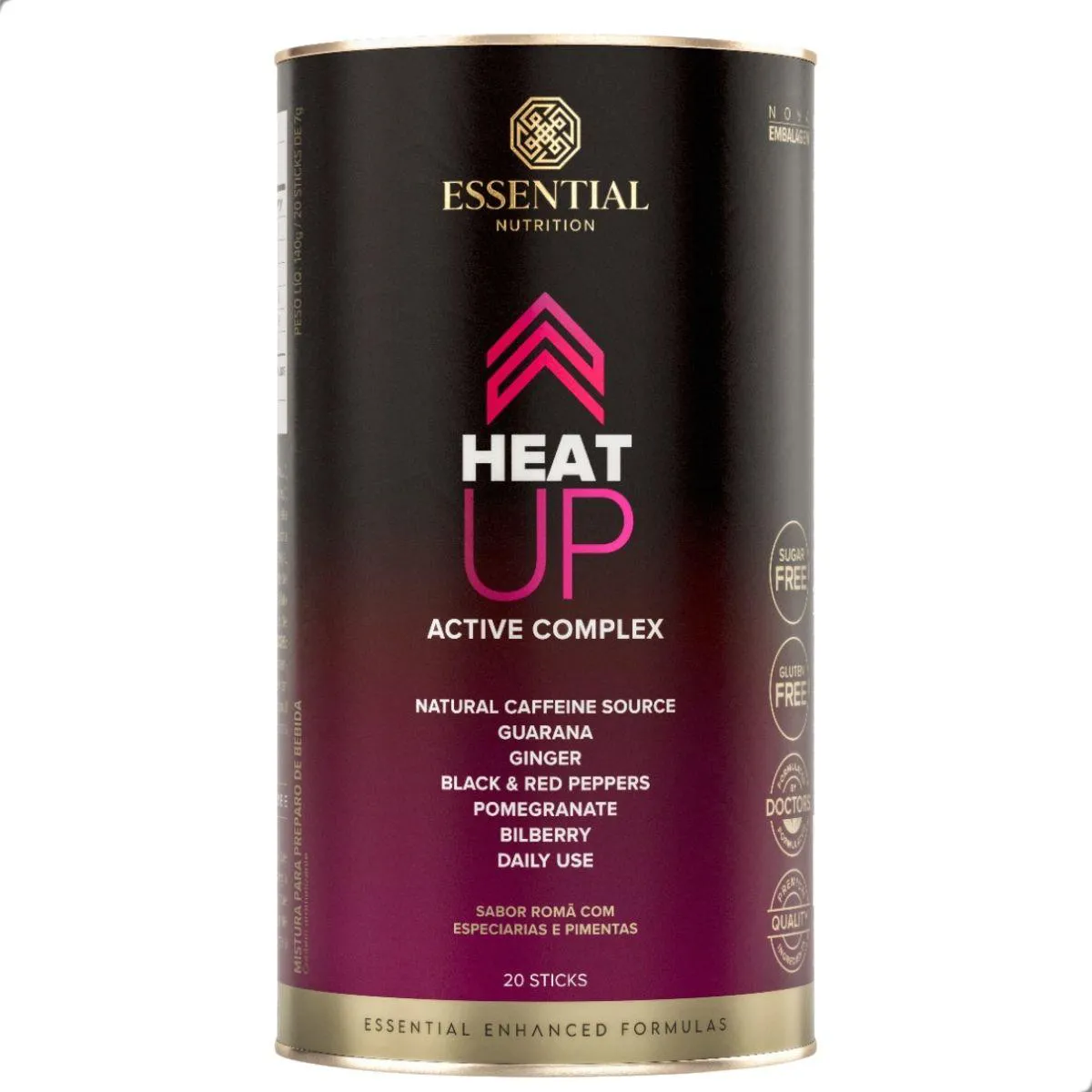 Heat Up da Essential Nutrition apresenta 20 sachês de 7 g, totalizando 140 g, formulados com extratos naturais para preparar bebida termogênica antes de atividades. Combina cafeína natural, gengibre, canela e vitaminas.