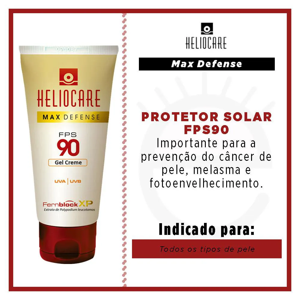 Heliocare Max Defense protetor solar em gel apresenta comprovada ação fotoimunoprotetora, fortalecendo defesas da pele, protegendo dos possíveis malefícios do sol e promovendo forte ação antioxidante. O protetor solar Heliocare Max Defense FPS90 possui algumas combinações para benefícios da sua pele, com filtros fotoestáveis e a exclusiva tecnologia Fernblock XP (rico em ácido Ferúlico, ácido Caféico), com imunoprotetor de origem natural proveniente do Extrato de Polypodium leucotomos.