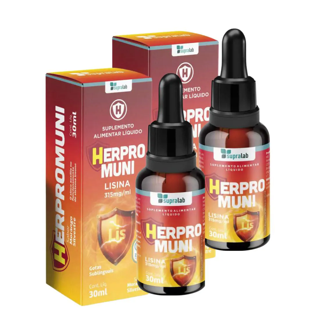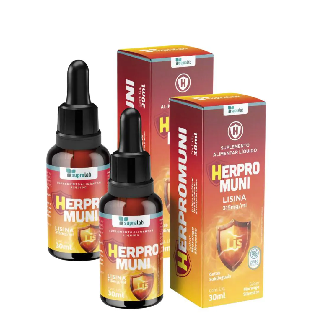 Herpomin Supralab – Lisina Essencial no Combate à Herpes SimplesContém 1 Frasco 30ml. Sabor Morango O suplemento alimentar em gotas de Lisina e Zinco, é uma combinação sinérgica projetada para fortalecer a imunidade, oferecer proteção contra vírus, além de promover a manutenção e recuperação da pele. A Lisina, um aminoácido essencial, desempenha um papel crucial na saúde imunológica, ajudando o organismo a fortalecer as defesas contra vírus e promovendo a cicatrização de feridas.Complementando este aminoácido, o Zinco é um mineral essencial que desempenha um papel vital na manutenção da saúde da pele, na síntese de proteínas e na proteção celular contra danos oxidativos, além de auxiliar no funcionamento do sistema imune. Um excelente aliado para a manutenção da sua saúde.INGREDIENTESÁgua potável, lisina, aroma idêntico ao natural de morango silvestre, vitamina c (ácido ascórbico), óxido de zinco, acidulante ácido cítrico, conservadores benzoato de sódio e sorbato de potássio e edulcorante glicosídeos de esteviol (stévia). NÃO CONTÉM GLÚTEN.