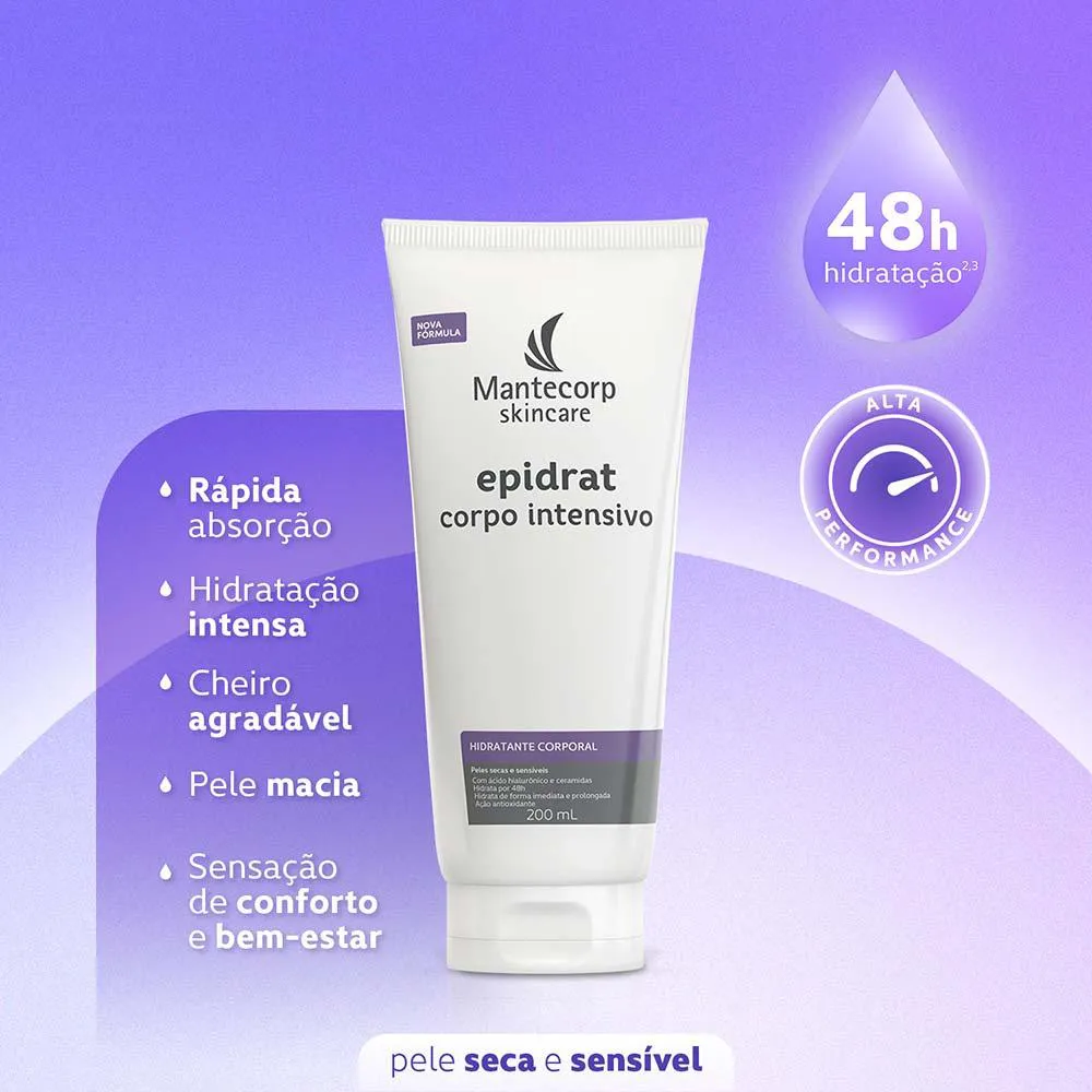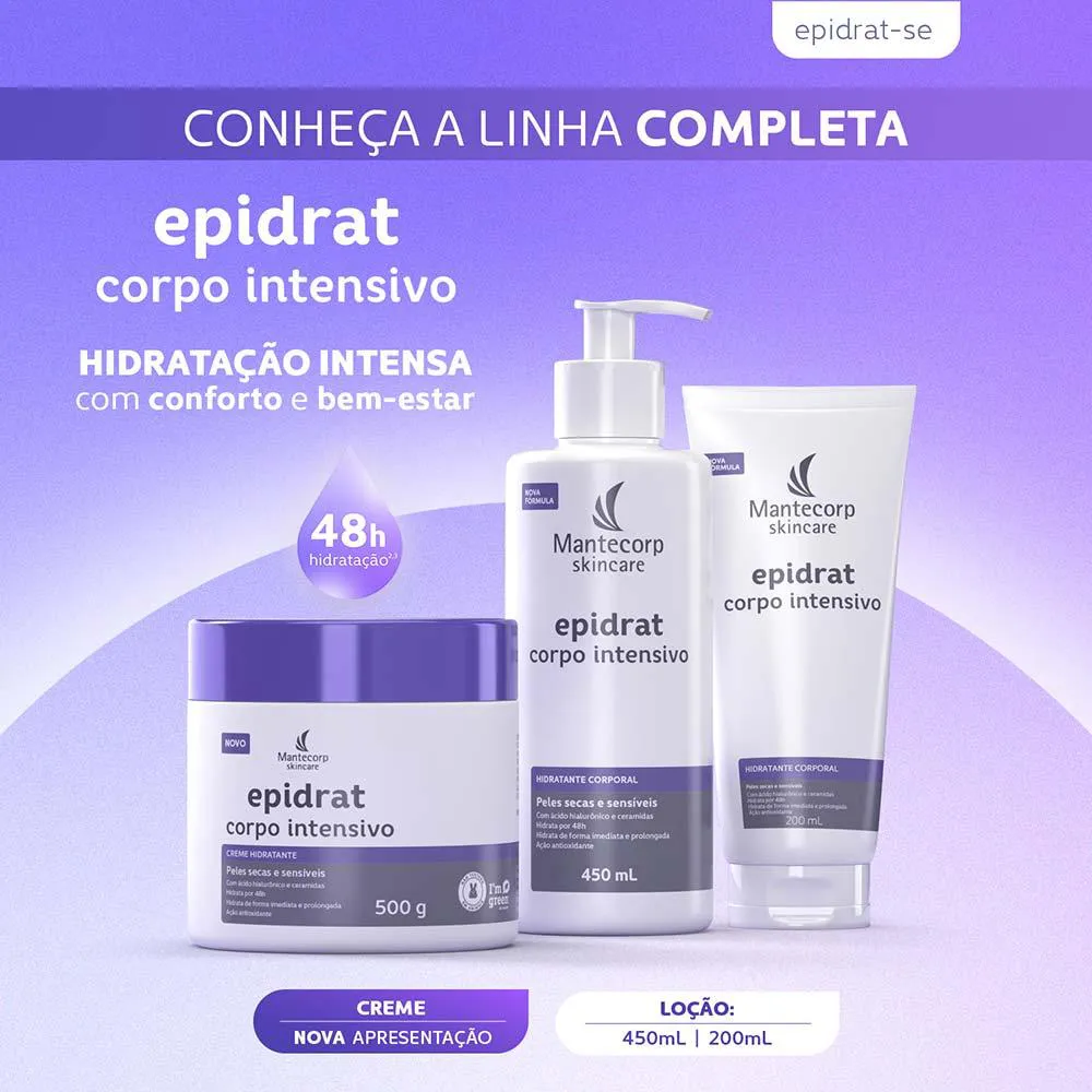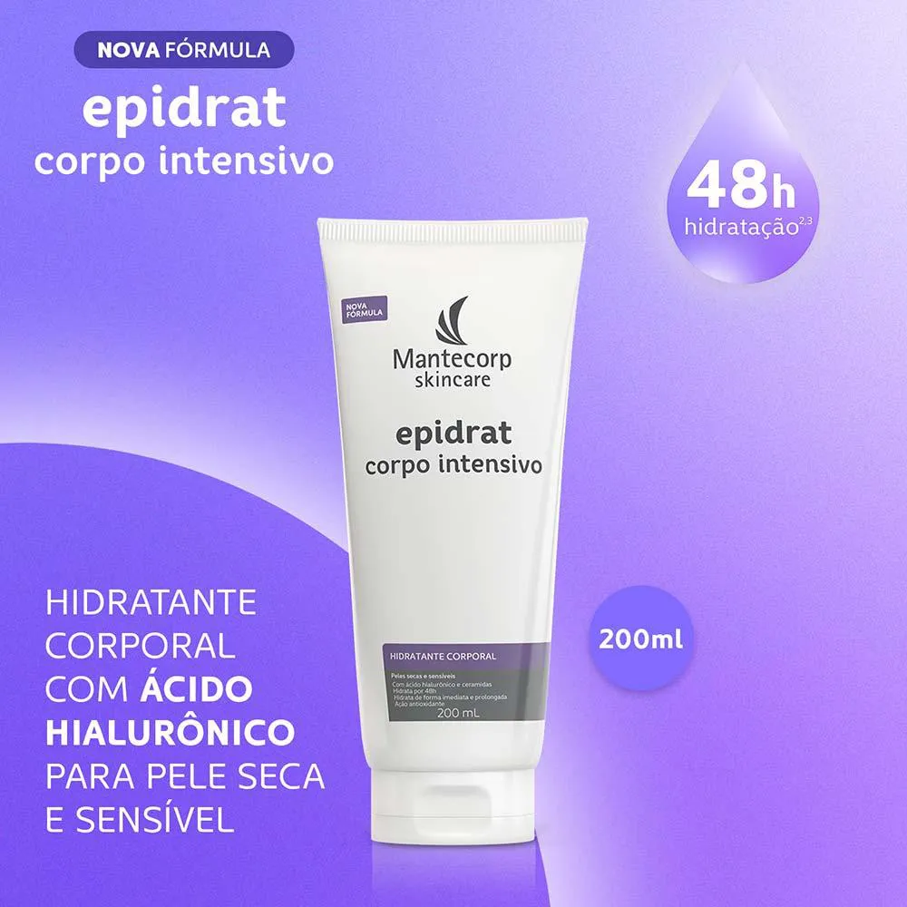 Epidrat corpo Intensivo é um hidratante corporal intensivo com ação antioxidante para peles secas, promovendo 24 horas de hidratação. O produto possui textura com rápida absorção sem deixar a pele com sensação pegajosa. Também é livre de fragrâncias, corantes e parabenos.
