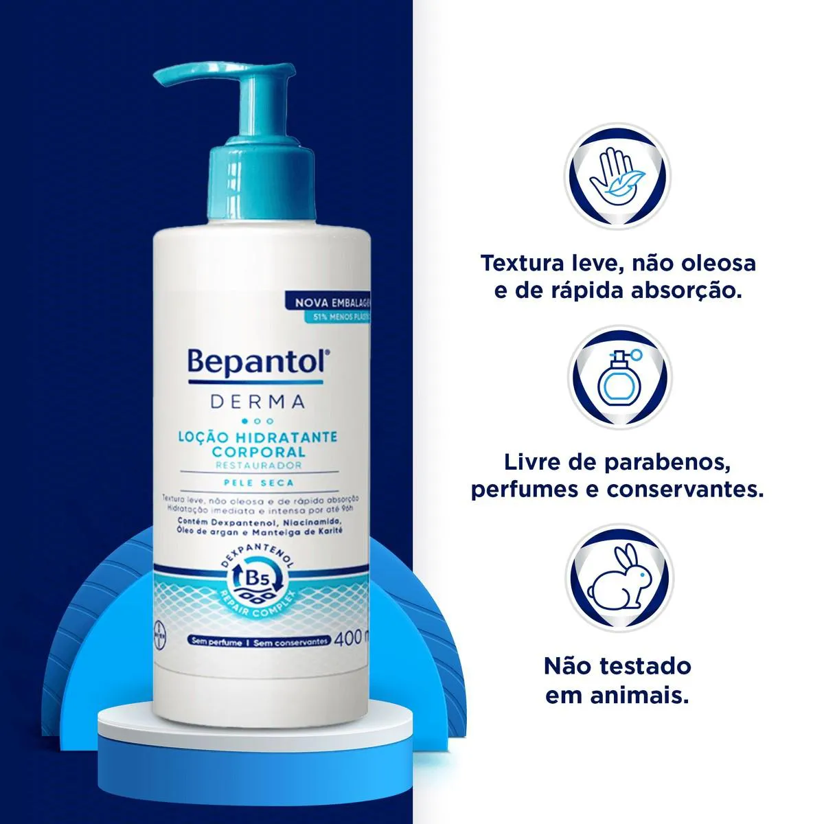 O Bepantol Derma Hidratante Restaurador Diário é um produto hidratante corporal com textura leve, não oleosa e de rápida absorção. Serve para acalmar, suavizar e hidratar a pele ressecada ou irritada, oferecendo hidratação imediata e duradoura por até 48 horas, deixando a pele macia e suave, sendo especialmente indicado para uso diário em peles secas.