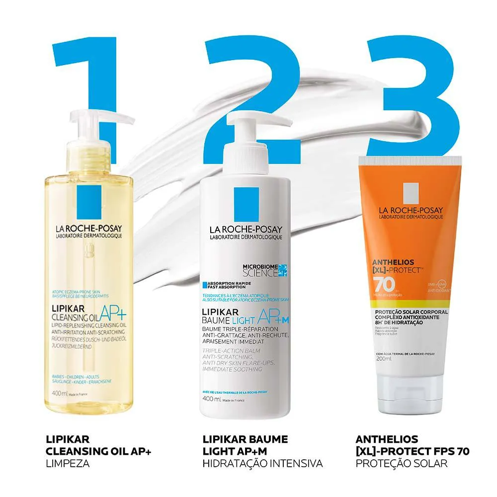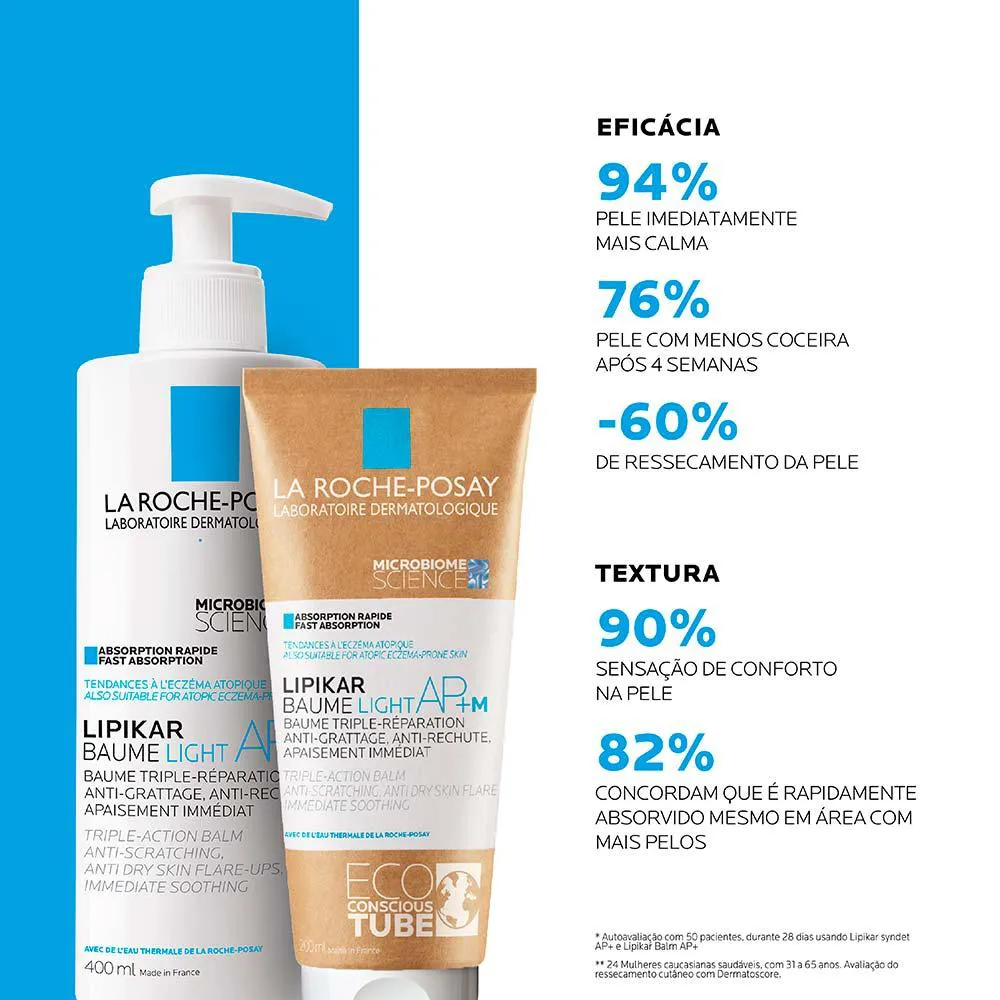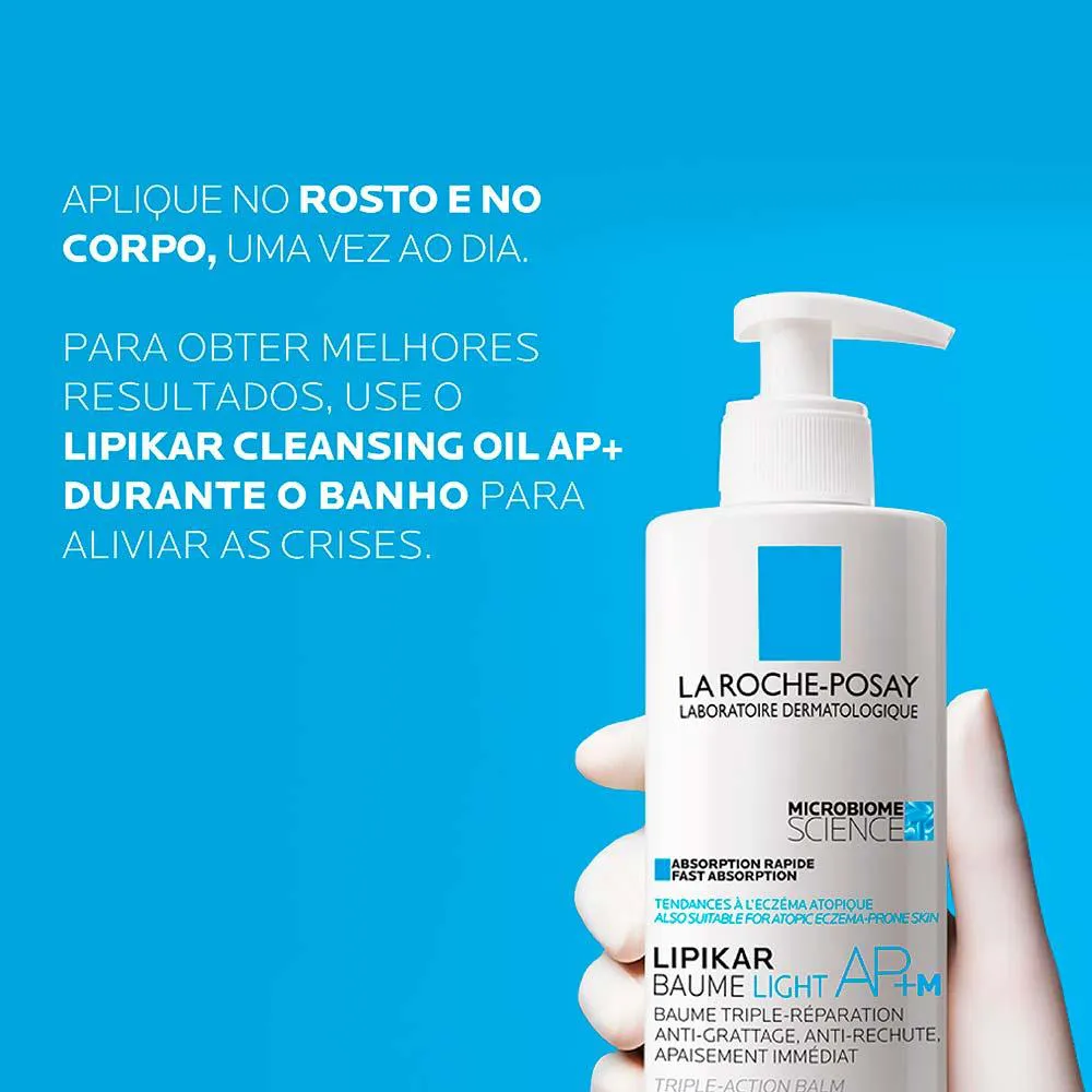 Lipikar Baume Light AP + M acalma imediatamente a pele seca/ressecada. Possui uma eficácia anti-coceira, anti-recidiva reforçada e reequilibra o microbioma da pele com uma rápida absorção. Acalma a pele, reduz a coceira, nutre e restaura a barreira da pele.