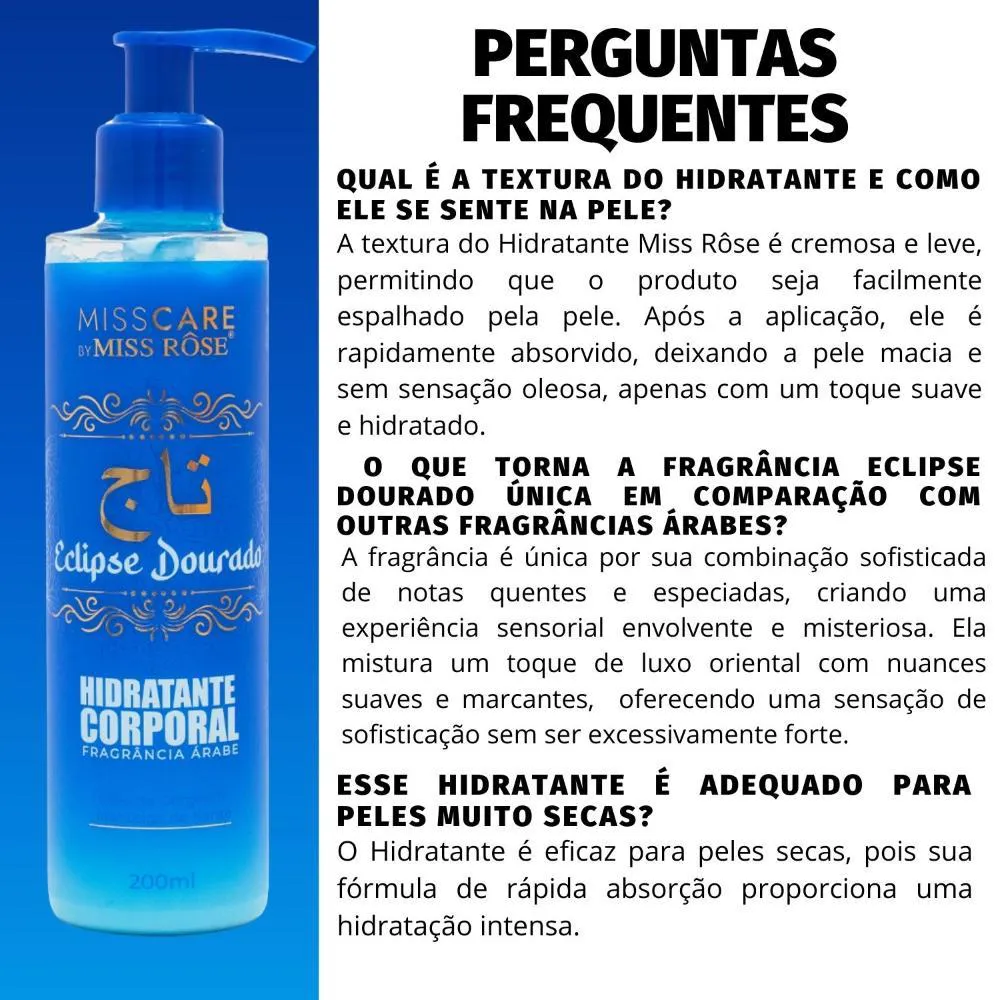 Hidratante Corporal Miss Rôse Fragrância Árabe Eclipse Dourado 200ml Experimente o segredo da pele radiante com o Hidratante Corporal Miss Rôse Eclipse Dourado. Enriquecido com ingredientes luxuosos, ele nutre profundamente com sua fragrância árabe e sedutora. Sinta a suavidade e a hidratação intensa enquanto desfruta de uma experiência sensorial única. Transforme sua rotina de cuidados com um toque de sofisticação oriental. Sua fórmula de rápida absorção é ideal para o uso diário, proporcionando frescor e suavidade, sem deixar sensação oleosa. Perfeito para manter a pele nutrida e delicadamente perfumada. Sua fórmula de rápida absorção proporciona frescor e suavidade, sem deixar sensação oleosa, sendo ideal para o uso diário, hidratando profundamente a pele, deixando-a macia e perfumada com uma fragrância sofisticada e envolvente. . Modo de Uso Aplique diretamente sobre o corpo, na quantidade desejada. Evite regiões sensíveis ou com ferimentos. Reaplique conforme desejar para uma melhor hidratação e perfume. Precauções Produto para uso externo, não recomendamos a aplicação sobre a pele irritada ou com ferimentos de qualquer natureza, caso haja qualquer sinal de irritação suspenda o uso e descontinue a utilização. Caso a irritação permaneça, consulte um médico. Mantenha longe do alcance de crianças, não deixe o produto exposto ao sol ou a fontes de calor excessivo. . Perguntas Frequentes A fragrância de Eclipse Dourado é forte? A fragrância de Eclipse Dourado é sofisticada e envolvente, com notas quentes e especiadas. Ela tem uma intensidade moderada e oferece um perfume duradouro na pele, sem ser excessivamente forte. Posso usar o Hidratante no rosto? Não, o Hidratante Corporal Miss Rôse Eclipse Dourado é desenvolvido para o corpo e não é indicado para o rosto, que possui necessidades específicas de cuidados. Esse hidratante deixa a pele oleosa? Não, o produto tem uma fórmula de rápida absorção, que hidrata profundamente a pele sem deixá-la oleosa. Ideal para uso diário, proporcionando uma sensação de frescor e suavidade. A fragrância dura o dia todo? A fragrância Eclipse Dourado tem boa fixação e pode durar por várias horas, dependendo do tipo de pele e das condições ambientais. . Código de Registro Sanitário (ANVISA) 25351.370702/2024-84