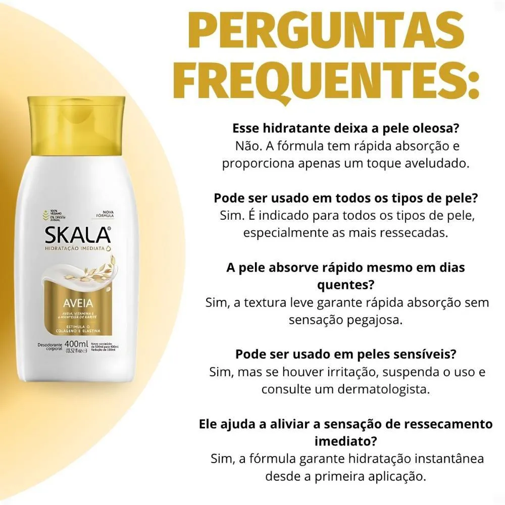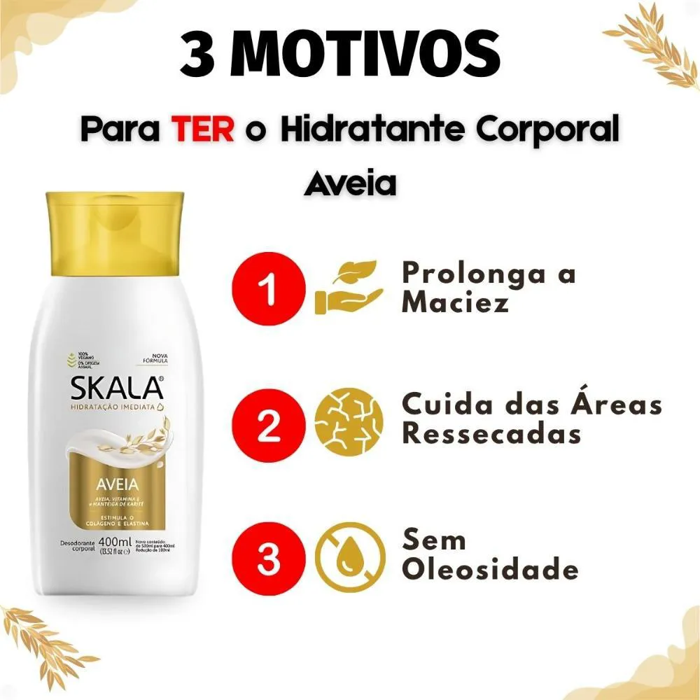 O Hidratante Corporal Skala Hidratação Imediata Aveia 400ml é a solução perfeita para conquistar uma pele intensamente nutrida, macia e com um toque aveludado. Sinta a transformação da sua pele, que irradia saúde e bem-estar a cada aplicação. Desenvolvido para proporcionar hidratação profunda e duradoura, este hidratante é ideal para quem busca praticidade e resultados visíveis, especialmente para peles secas e sensíveis. Enriquecido com o poder nutritivo do extrato de Aveia, este hidratante desodorante envolve sua pele em uma experiência sensorial única, proporcionando um toque suave e uma sensação de frescor prolongada. Desperte a beleza natural da sua pele com o Hidratante Skala Aveia, seu aliado diário para uma hidratação impecável.Benefícios Principais