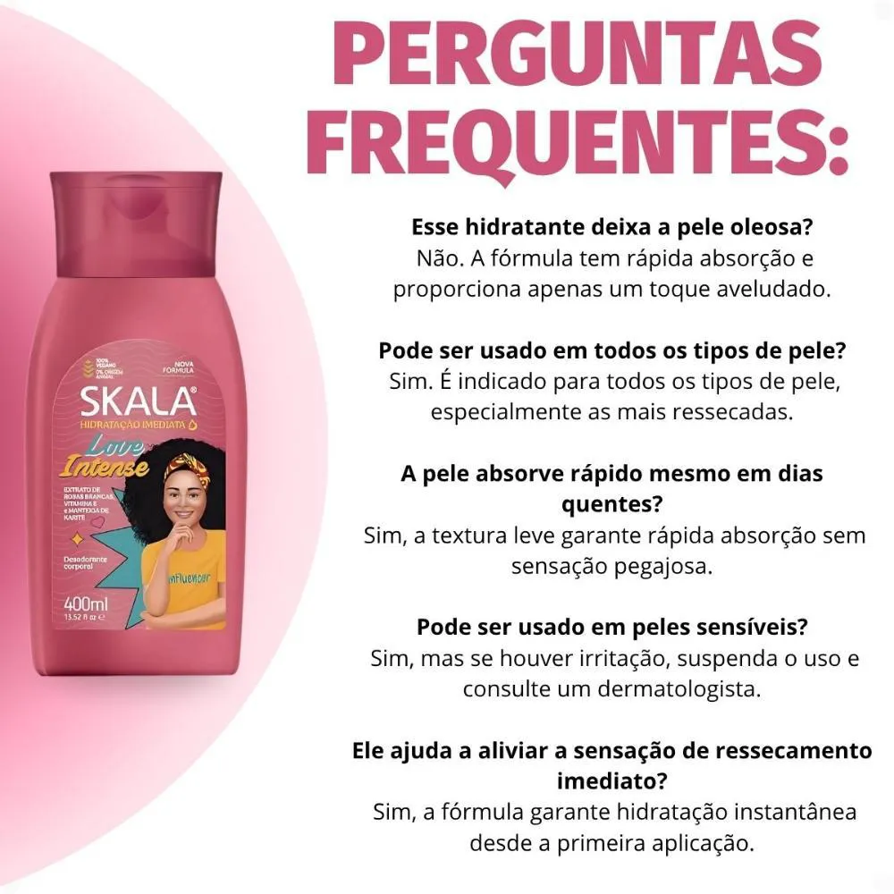 O Hidratante Corporal Skala Hidratação Imediata Love Intense 400ml é um produto cosmético desenvolvido para hidratar e cuidar da pele, com uma fórmula vegana e livre de ingredientes nocivos. Sua composição é especialmente criada para nutrir e proteger a derme, oferecendo uma solução completa para os cuidados corporais diários.