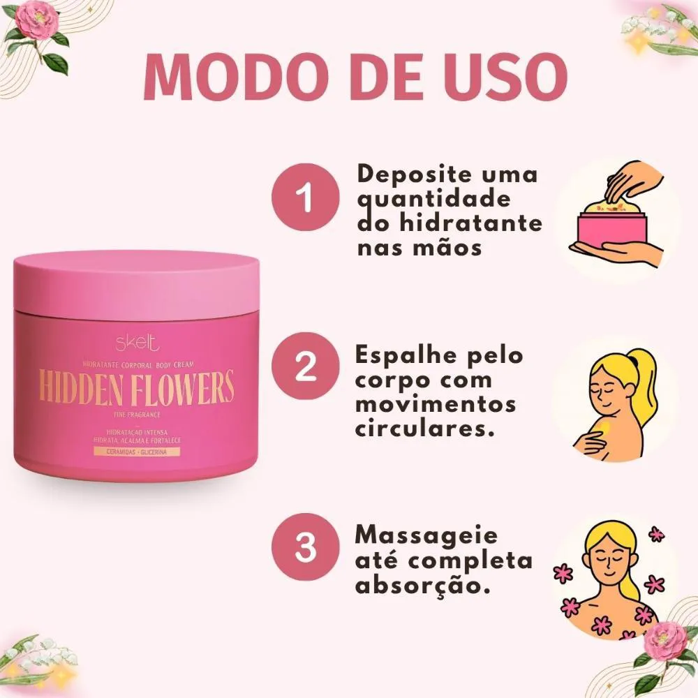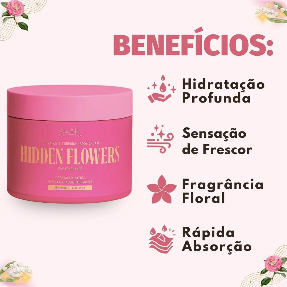 O Hidratante Corporal Skelt Hidden Flowers oferece:- Hidratação profunda e duradoura para uma pele visivelmente mais saudável.- Fragrância