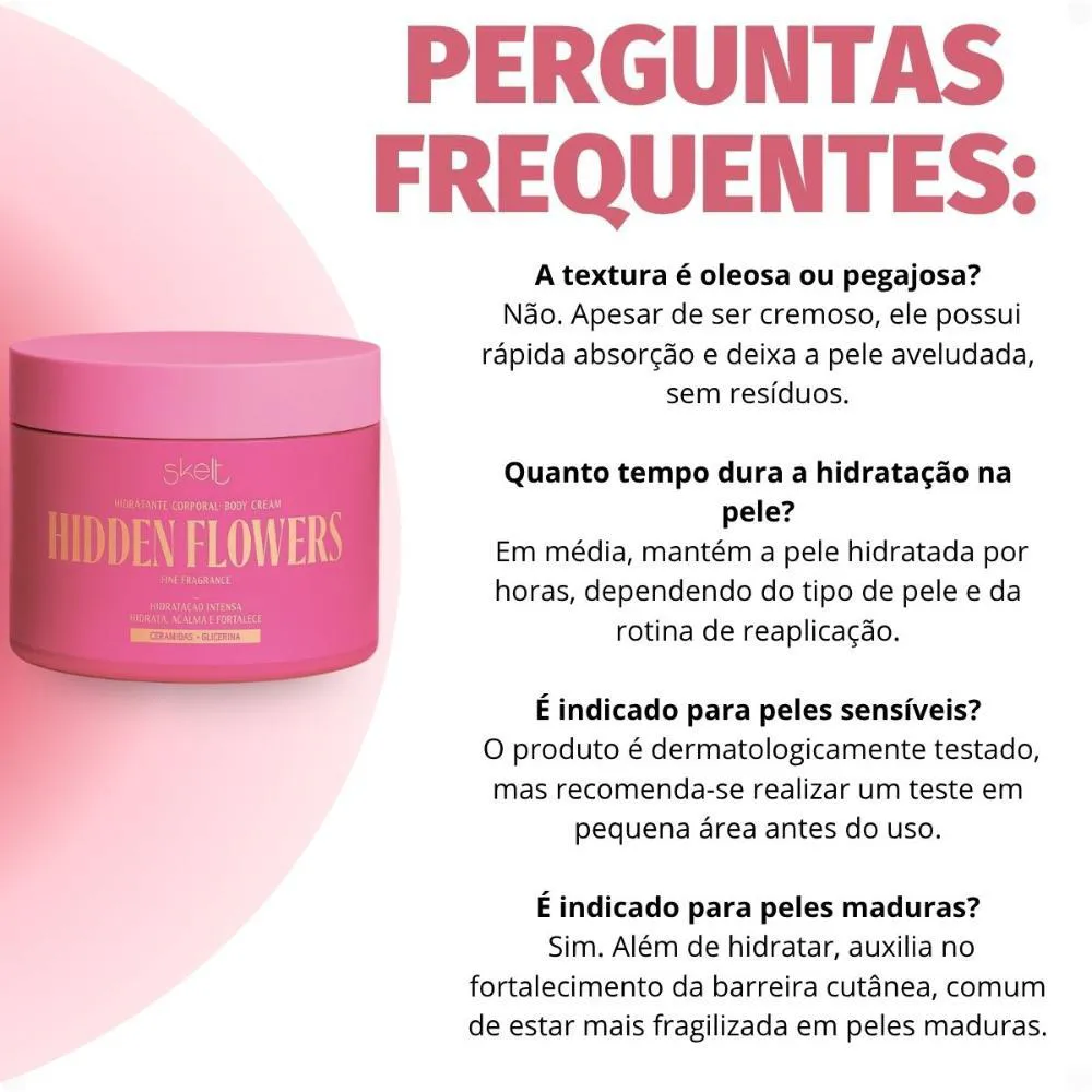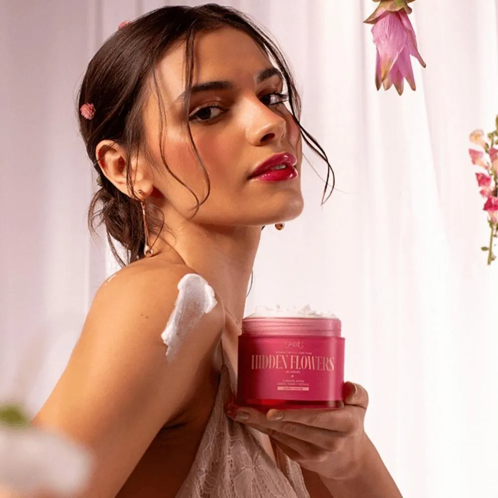 O Hidratante Corporal Skelt Hidden Flowers se destaca por:- Fórmula exclusiva com Ceramida e Glicerina Vegetal, que proporcionam hidratação intensa e duradoura.- Fragrância sofisticada e envolvente, inspirada em flores exóticas, que transforma o cuidado corporal em um momento de prazer.- Embalagem prática e elegante, perfeita para levar na bolsa e usar sempre que necessário.- Produto 100% vegano e cruelty-free, desenvolvido com ingredientes de alta qualidade e respeito ao meio ambiente.- Livre de parabenos e óleo