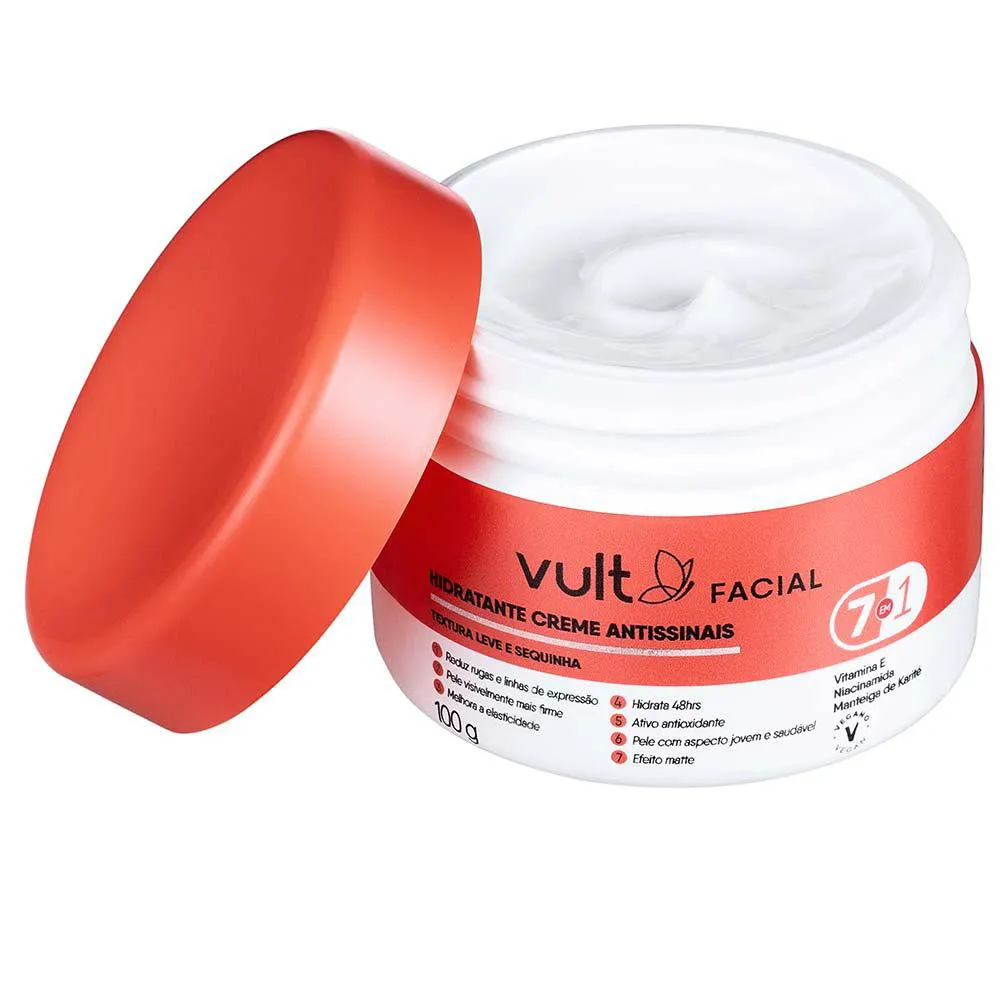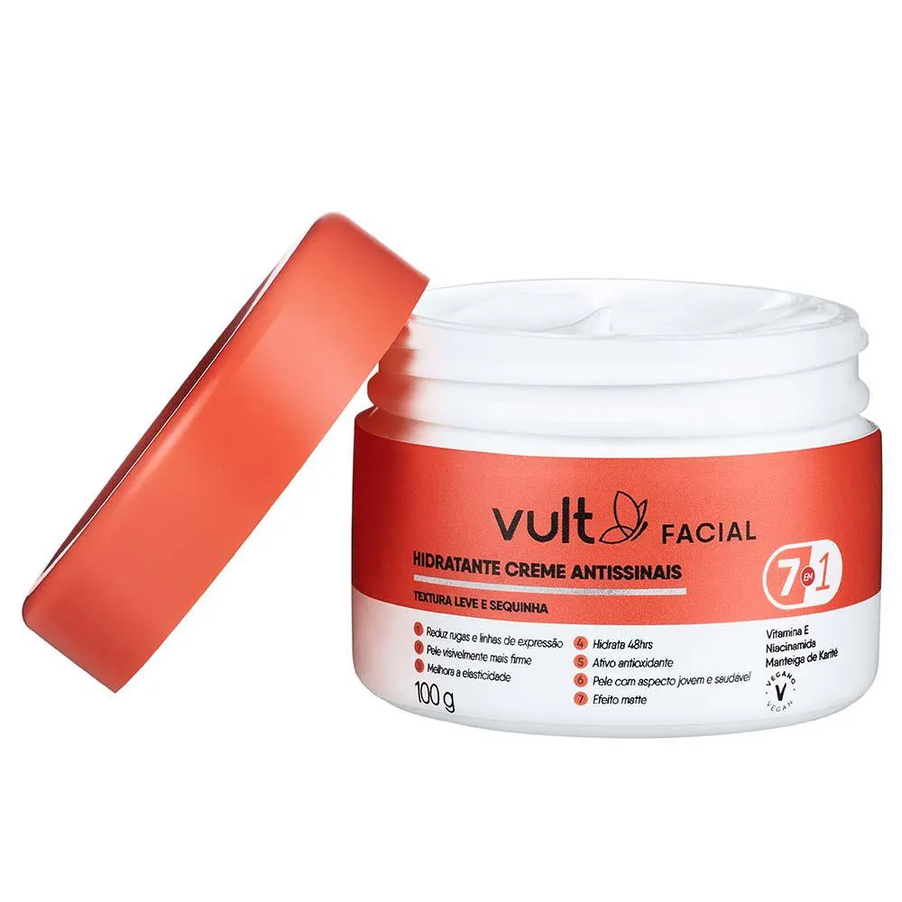 O Hidratante Creme Facial Antissinais 7 em 1 de Vult oferece 48hrs de hidratação e conta com vitamina e, poderoso ativo antioxidante, Niacinamida e Manteiga de Karité, para uma ação antissinais que reduz rugas, linhas de expressão e deixa a pele visivelmente mais firme. Textura leve de rápida absorção e acabamento matte deixa sua pele com aspecto jovem, saudável e radiante!