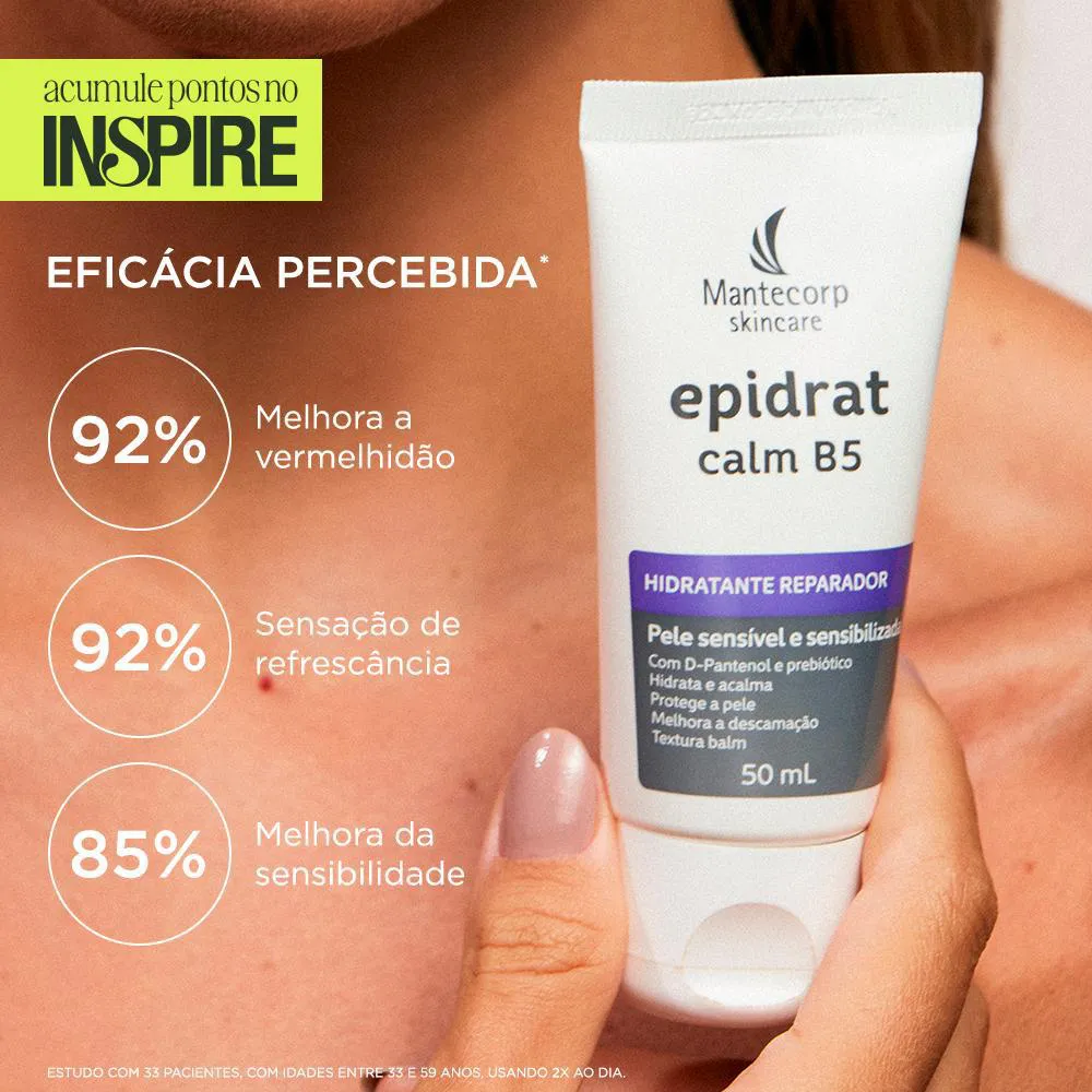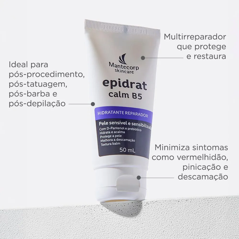 O Epidrat B5 é um hidratante multireparador que hidrata, regenera e acalma a pele, contendo Sens C + Prebióticos e D Pantenol em sua composição. Serve para proporcionar conforto imediato, sensação refrescante, melhorar descamação, coceira e vermelhidão, podendo ser utilizado em pós depilatório, lábios ressecados, pele sensibilizada e após procedimentos.