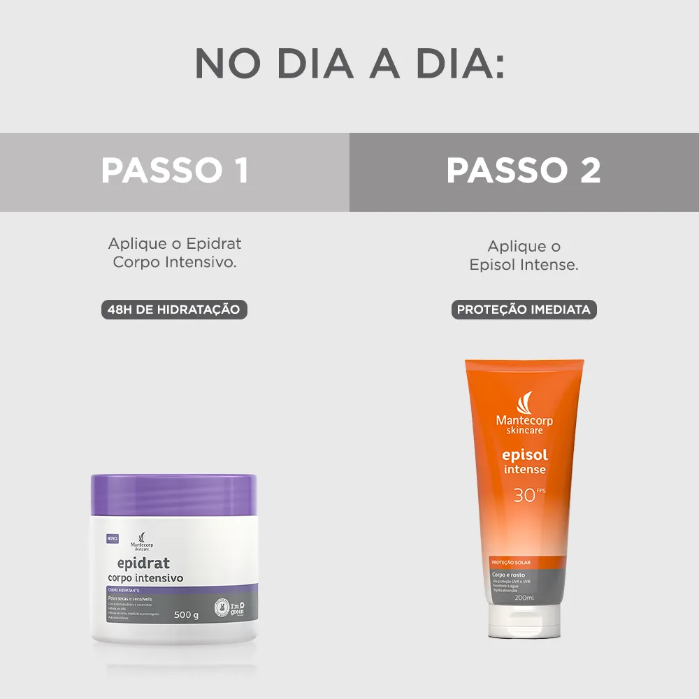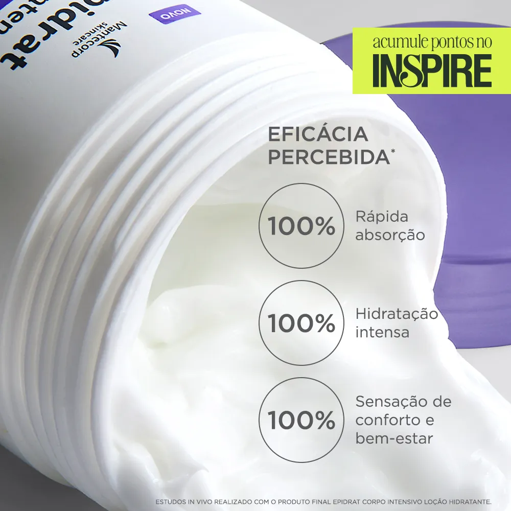 EPIDRAT corpo INTENSIVO é um creme hidratante corporal de uso diário desenvolvido para a pele seca e extrasseca, sendo testado também em pele sensível. Sua fórmula contém ceramidas que garantem ao produto hidratação imediata e prolongada por até 48 horas, e ácido hialurônico, que oferece hidratação profunda e age na elasticidade da pele, melhorando sua textura. Epidrat Corpo Intensivo ajuda a restaurar e manter a proteção da barreira natural da pele, deixando-a macia, proporcionando a recuperação imediata da pele esbranquiçada pelo ressecamento. Com sua textura de rápida absorção, deixa uma agradável sensação de pele protegida.