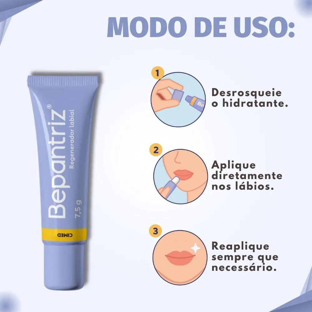 Aplicar o Hidratante Labial Bepantriz Cimed Regenerador Labial 7,5g diretamente nos lábios sempre que houver necessidade de hidratação. Pode ser usado várias vezes ao dia para manter os lábios protegidos e saudáveis.Anvisa: 25351.493367/2022-20