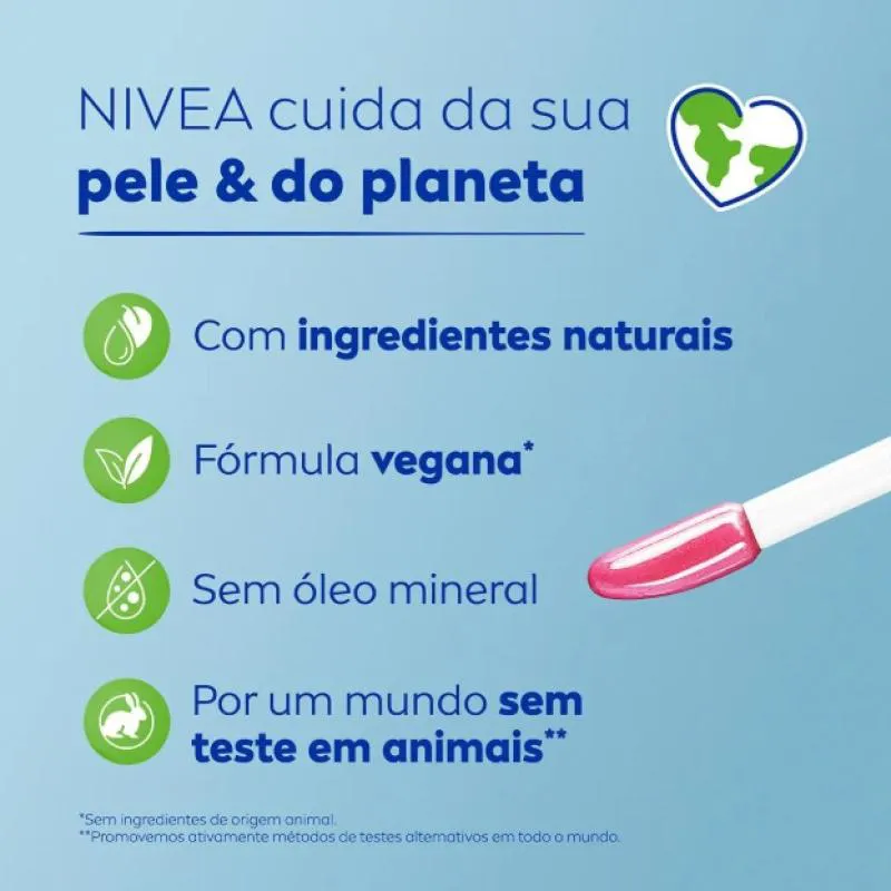 Com um brilho natural que combina com todos os tons de pele, sua fórmula vegana conta com ingredientes naturais e sem testes em animais. O Nivea Lip Oil pode ser combinado com um esfoliante para destacar ainda mais seus lábios de forma natural ou com uma base de cor forte.