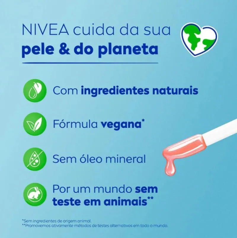 Com um brilho natural que combina com todos os tons de pele, sua fórmula vegana conta com ingredientes naturais e sem testes em animais. O Nivea Lip Oil pode ser combinado com um esfoliante para destacar ainda mais seus lábios de forma natural ou com uma base de cor forte.