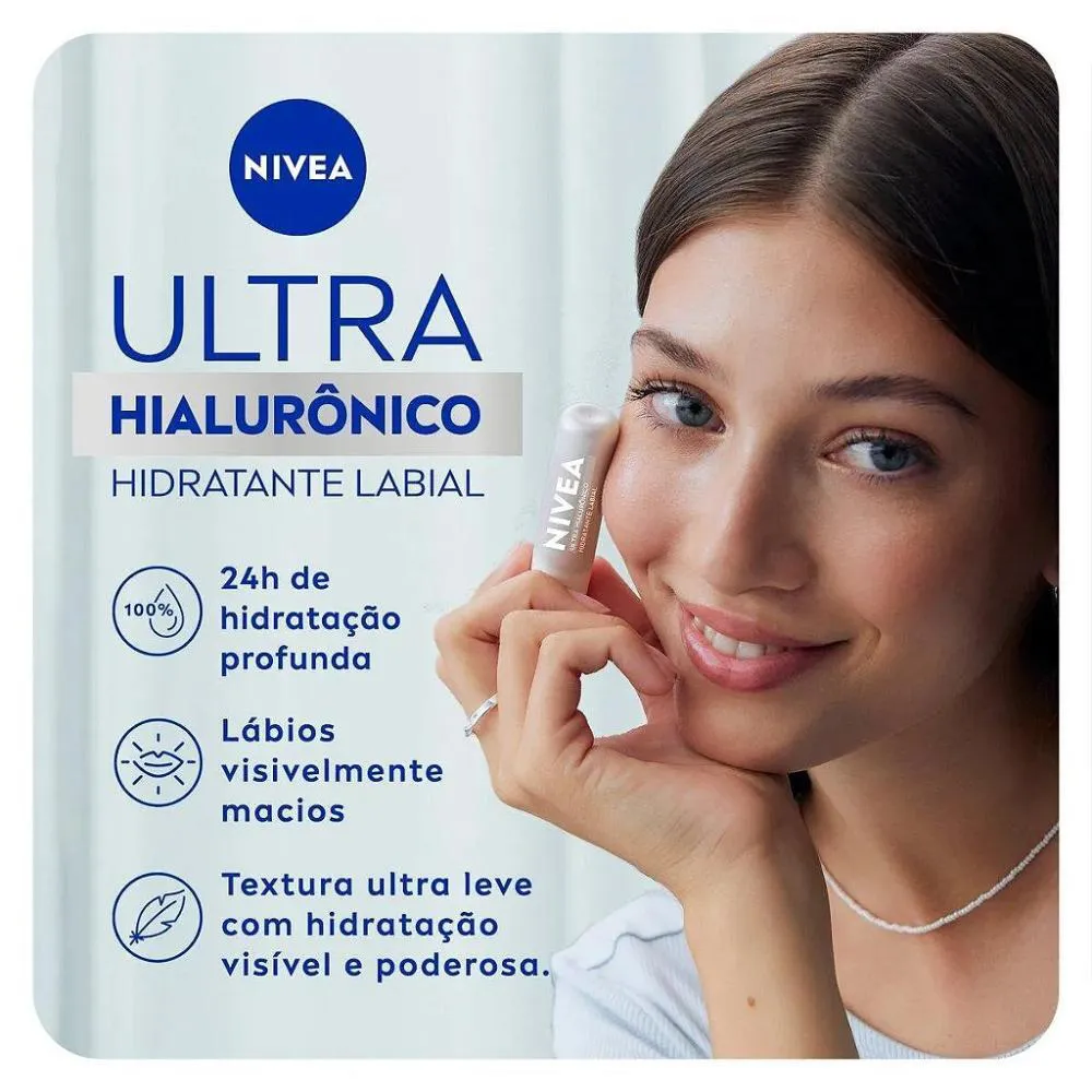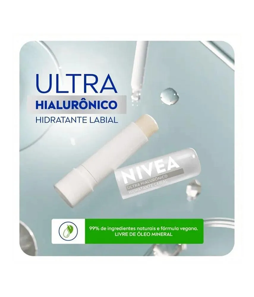 O NIVEA Hidratante Labial Ultra Hialurônico possui fórmula ultra-hidratante que preenche profundamente os lábios por 24 horas. Sua textura é ultra-leve e não oleosa, garantindo maciez e hidratação instantânea. Para que serve? Enriquecido com Ácido Hialurônico, um ingrediente altamente eficaz que retém a água dos lábios e ativa a produção natural de ácido hialurônico da pele. Promove maciez e suavidade instantânea, além de dar efeito de volume. Benefícios e diferenciais - Melhora comprovada na hidratação - Lábios suaves e macios instantaneamente - Efeito lábios volumosos - Textura ultraleve não oleosa - Com Ácido Hialurônico - Fórmula vegana - 99% de ingredientes de origem natural - 24h de hidratação profunda - Livre de óleo mineral Uma unidade de embalagem contém 5,2g