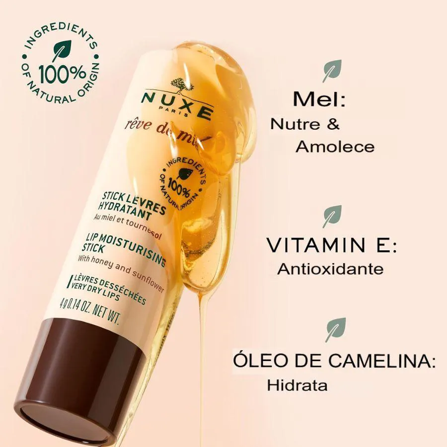 NUXE Rêve de Miel Stick Hidratante lábios 4g é um bastão hidratante labial perfeito para o uso diário em lábios secos e/ou danificados.
