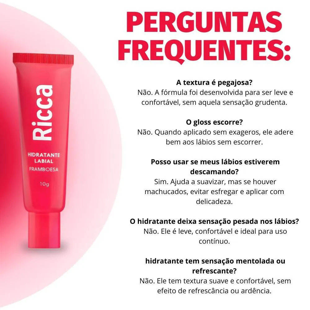 Descubra o Hidratante Labial Ricca Efeito Gloss, inclui acessório para levar seu hidratante labial para qualquer lugar. O aliado perfeito para lábios hidratados e com um brilho irresistível. Este produto combina cuidado e beleza em uma única aplicação, proporcionando uma experiência sensorial agradável com seu delicioso aroma. Ideal para quem busca realçar a beleza natural dos lábios enquanto os mantém macios e protegidos, este hidratante labial é a escolha ideal para quem procura praticidade e resultados eficazes.Benefícios Principais