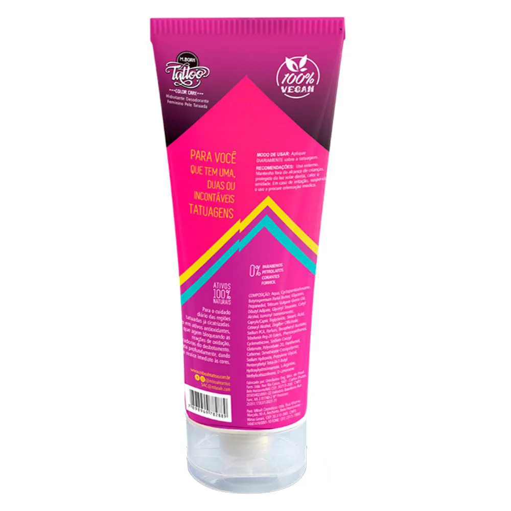 Tattoo Color Care Feminino da M.Boah é um hidratante corporal para o cuidado diário da pele tatuada, desenvolvido especialmente para a pele da mulher, com ingredientes naturais que hidratam profundamente, protegem as cores e os traços da tatuagem.