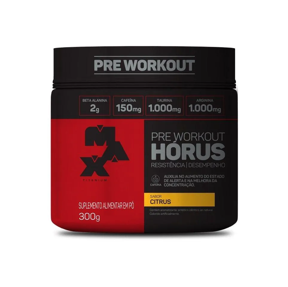 Hórus (300g) - Max Titanium A Evolução do Melhor Pré-Treino Chegou. HÓRUS é um produto para ser consumido no pré treino. Para quem se exercita com intensidade, a fadiga é um dos principais fatores que influenciam o rendimento, por isso desenvolvemos HÓRUS, com uma formulação altamente tecnológica e ingredientes de altíssima qualidade, para você ter um treino com muito mais eficiência.Sinta O Poder De Hórus! Benefícios: * 2g de Beta Alanina, por porção;* 1.000mg de Arginina;* 1.000mg de Taurina;* 150mg de Cafeína;* Diminuição drástica da fadiga muscular;* Aumento elevado da Vasodilatação;* Muito mais força e resistência muscular;* Melhora o desempenho cognitivo; * Acelera o crescimento muscular;* Composição completa em um ÚNICO produto.